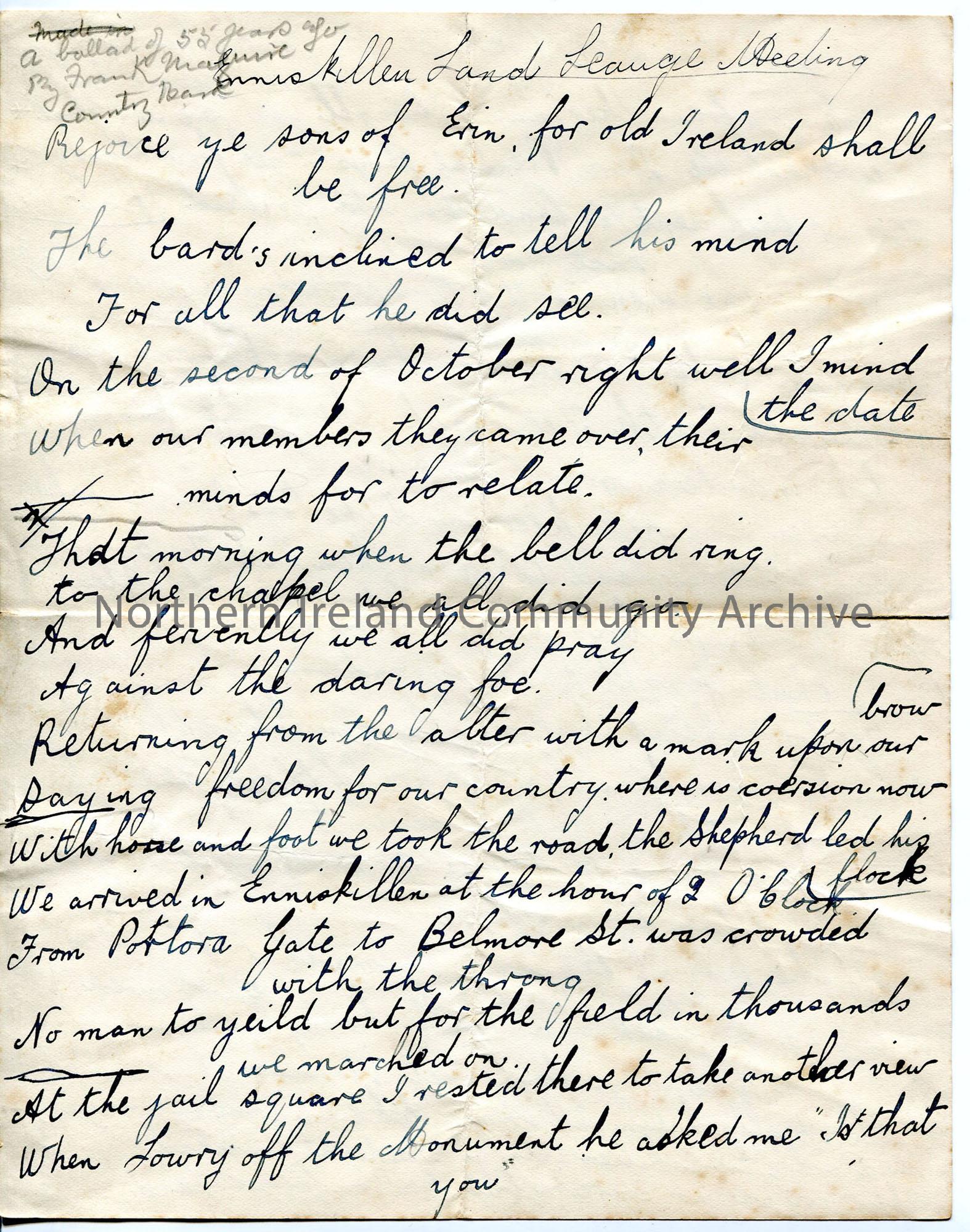 Handwritten words to 'Enniskillen Land League Meeting', with added side notes in pencil - 'a ballad of 55 years ago'
