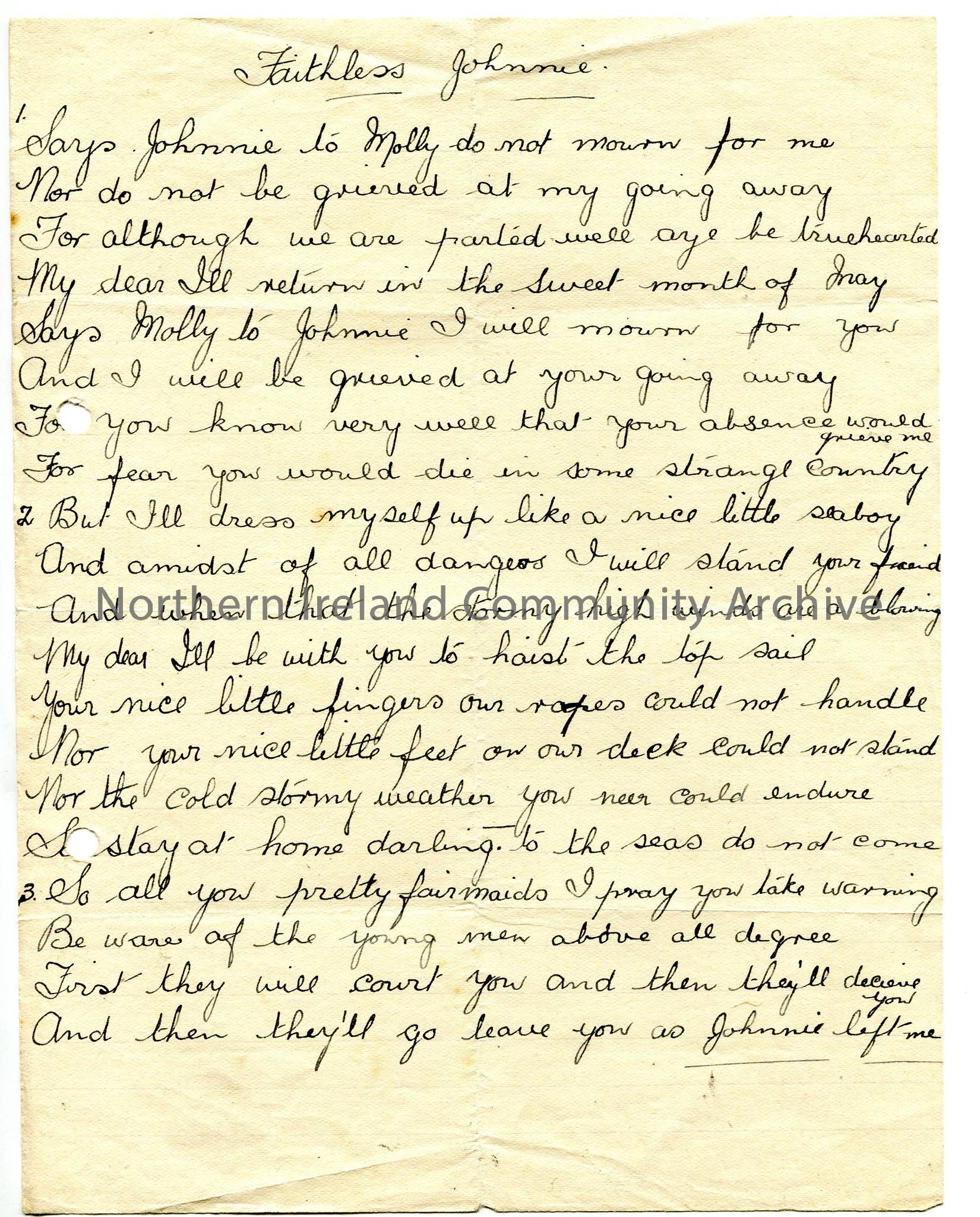 Handwritten words to ‘Faithless Johnnie’, alternative version