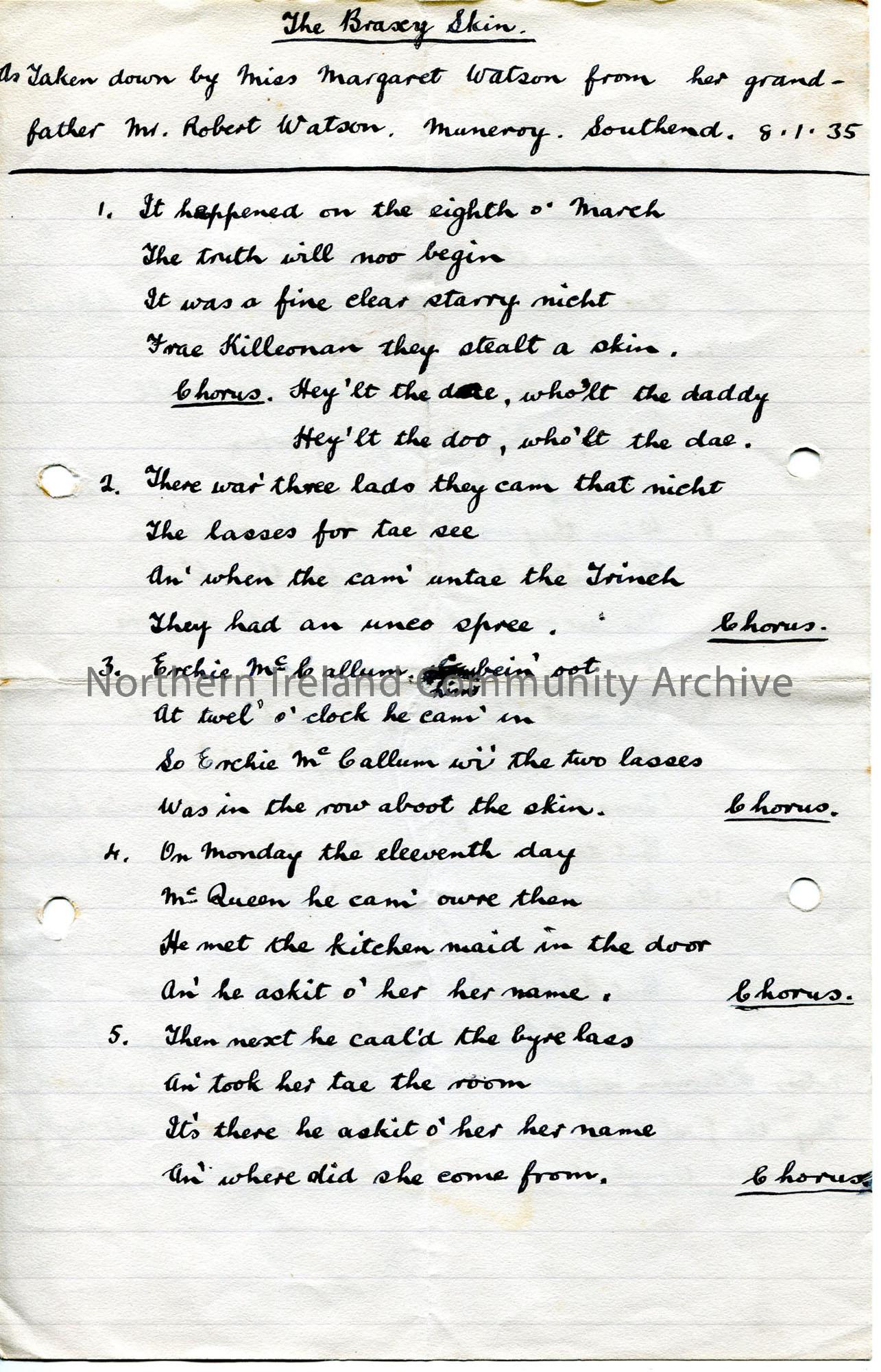 Handwritten words to ‘The Braxy Skin’ as known in Kintyre. Uses local dialect (Scottish). Handwriting appears to be Archie McEachran’s.