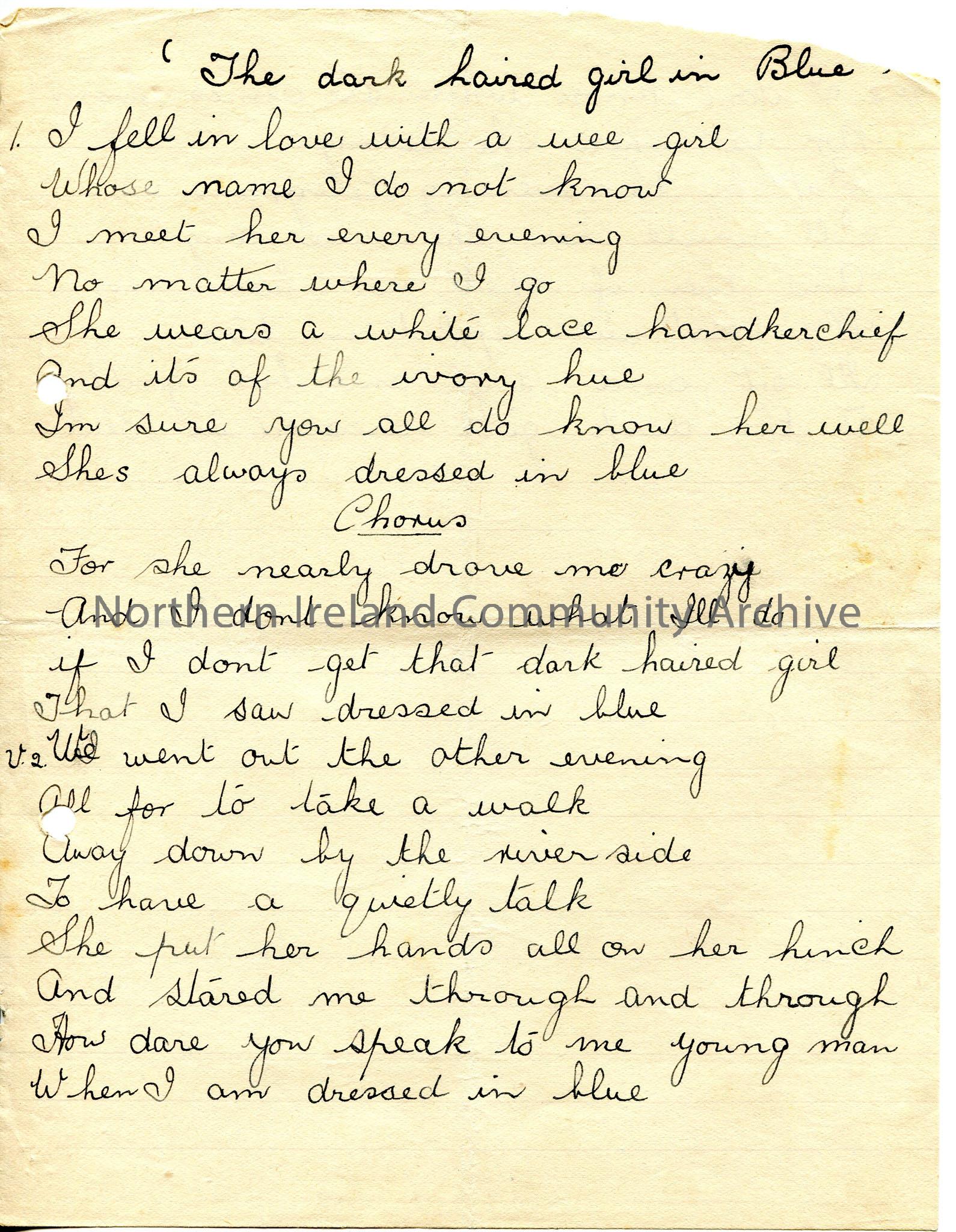 Handwritten words to ‘The Dark Haired Girl in Blue’.