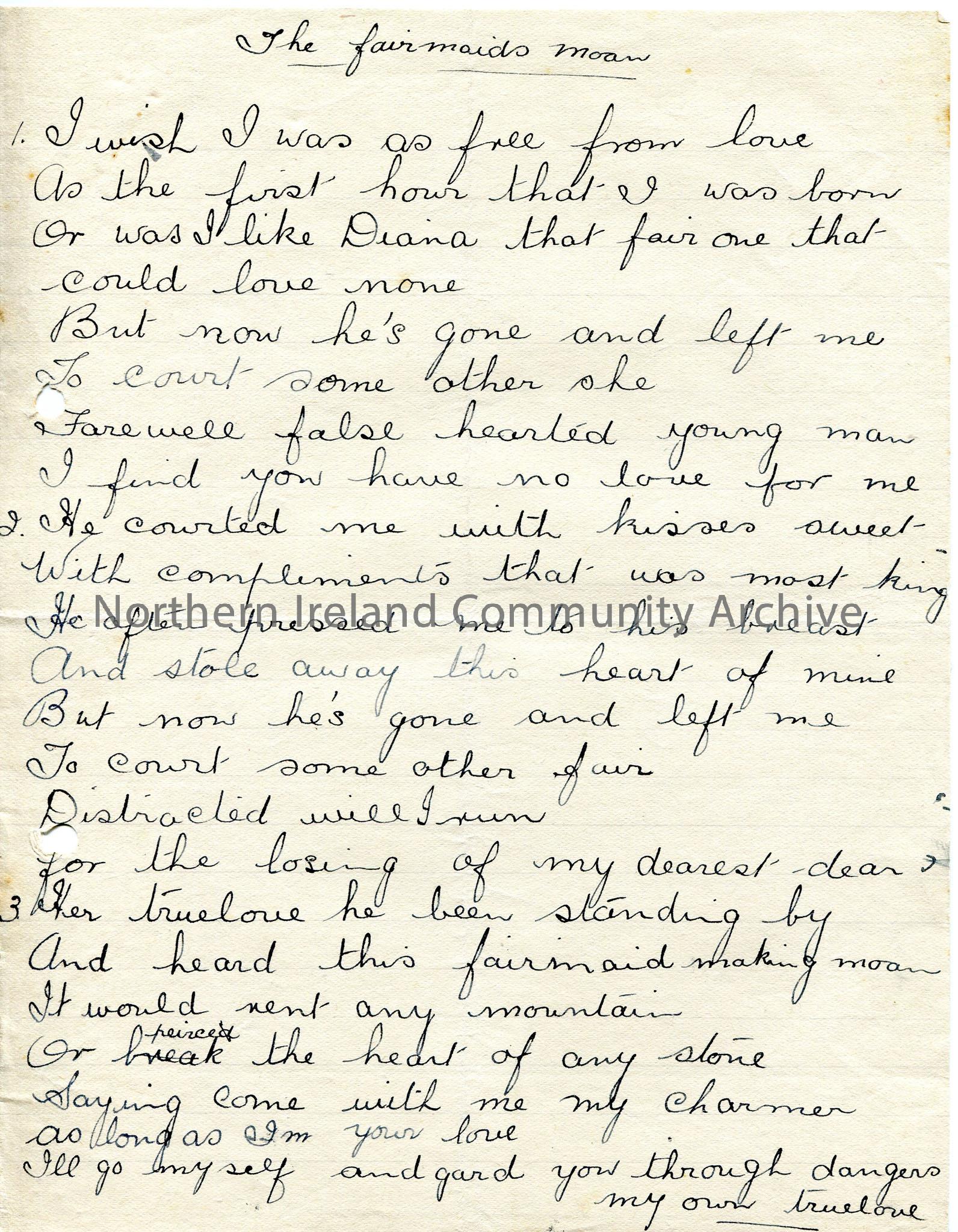 Handwritten words to 'The Fair Maid's Moan'.
