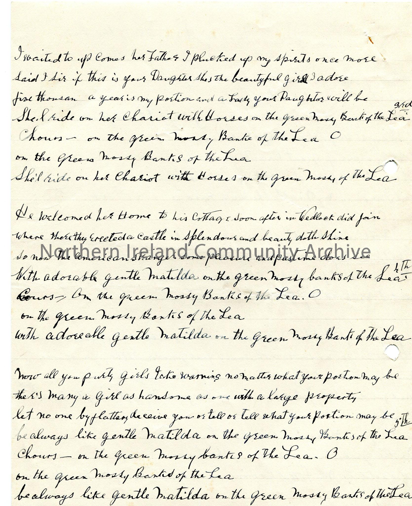 Handwritten words to ‘The Green Mossy Banks of the Lea’. Pencilled at side is ‘See Banks of Boyne’ – words fit that tune – img126