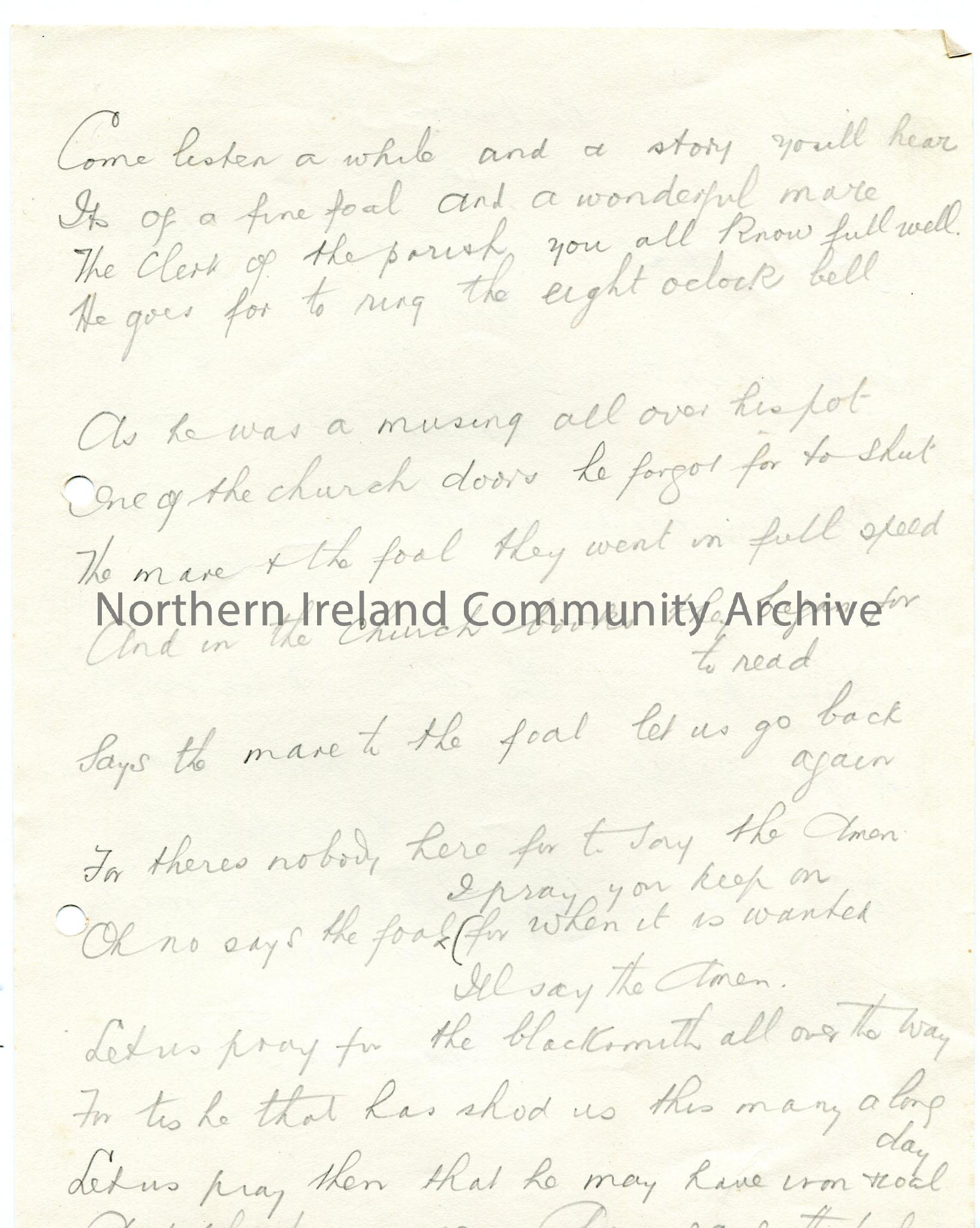 Handwritten words to untitled verses about foal and mare