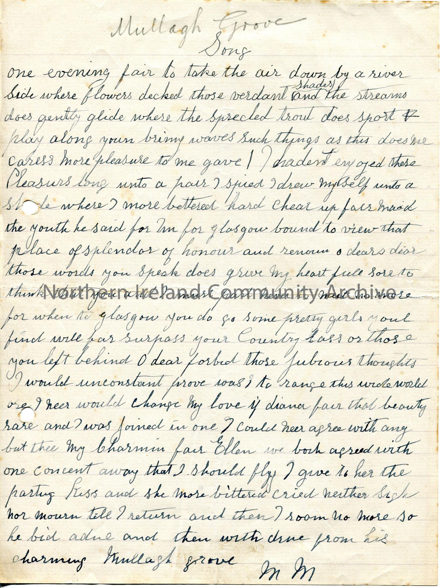 Handwritten words under heading ‘Song’. Pencilled above that – ‘Mullagh Grove’. Signed ‘M M’. Youth leaving love for Glasgow