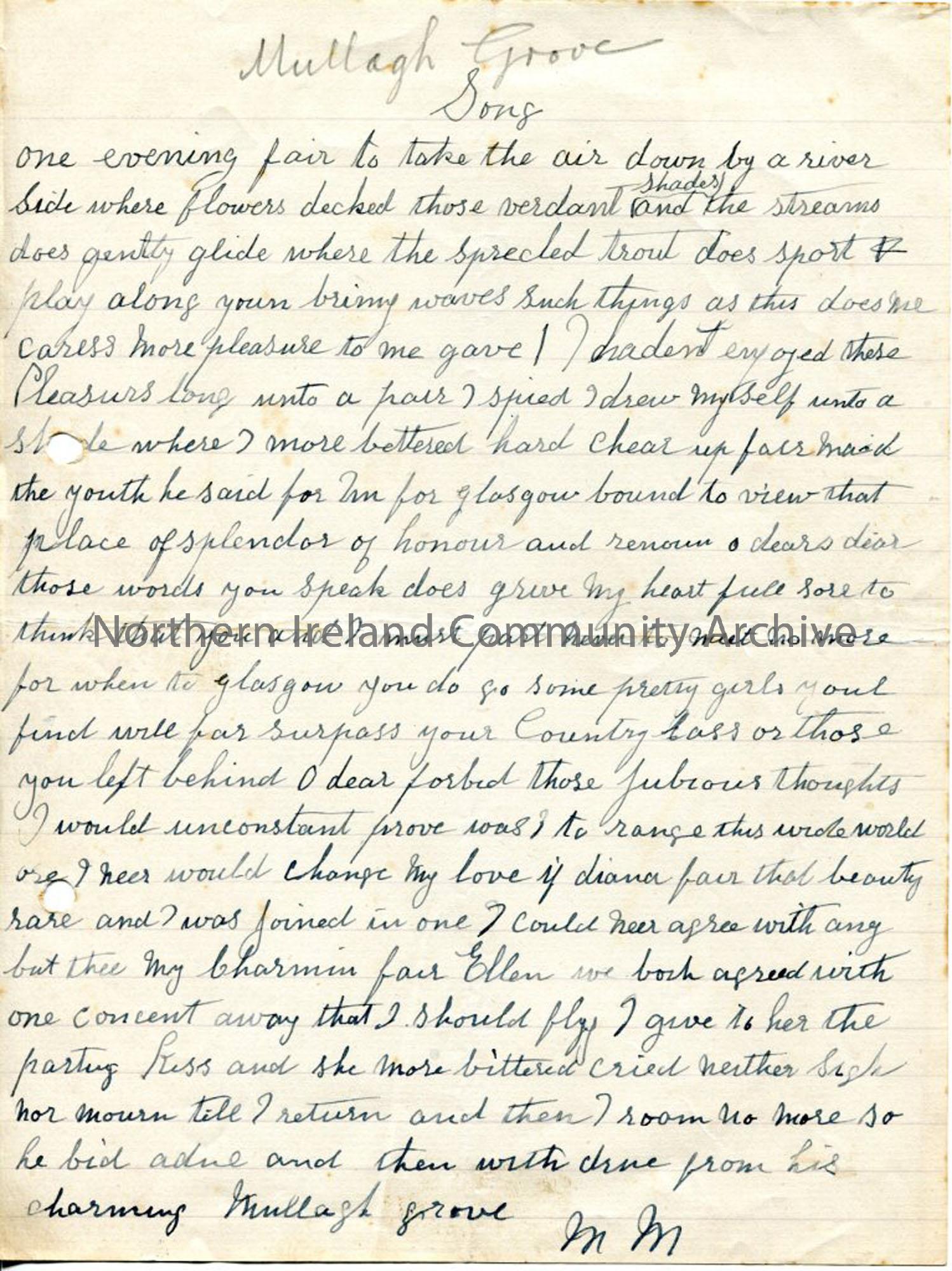 Handwritten words under heading 'Song'. Pencilled above that - 'Mullagh Grove'. Signed 'M M'. Youth leaving love for Glasgow