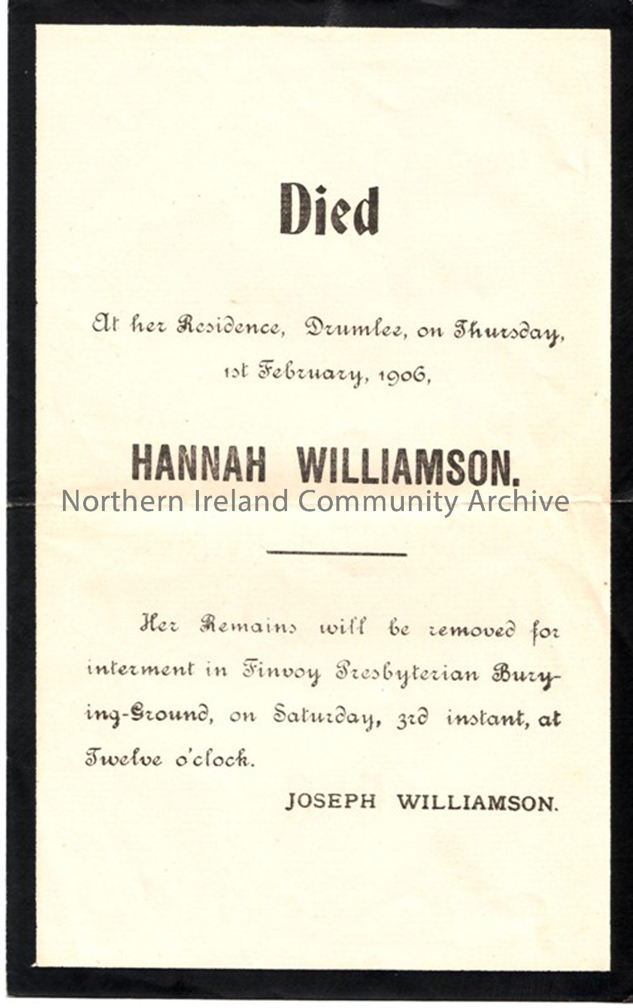 Hannah Williamson of Drumlee, buried in Finvoy Presbyterian Burying Ground d. 1st February 1906