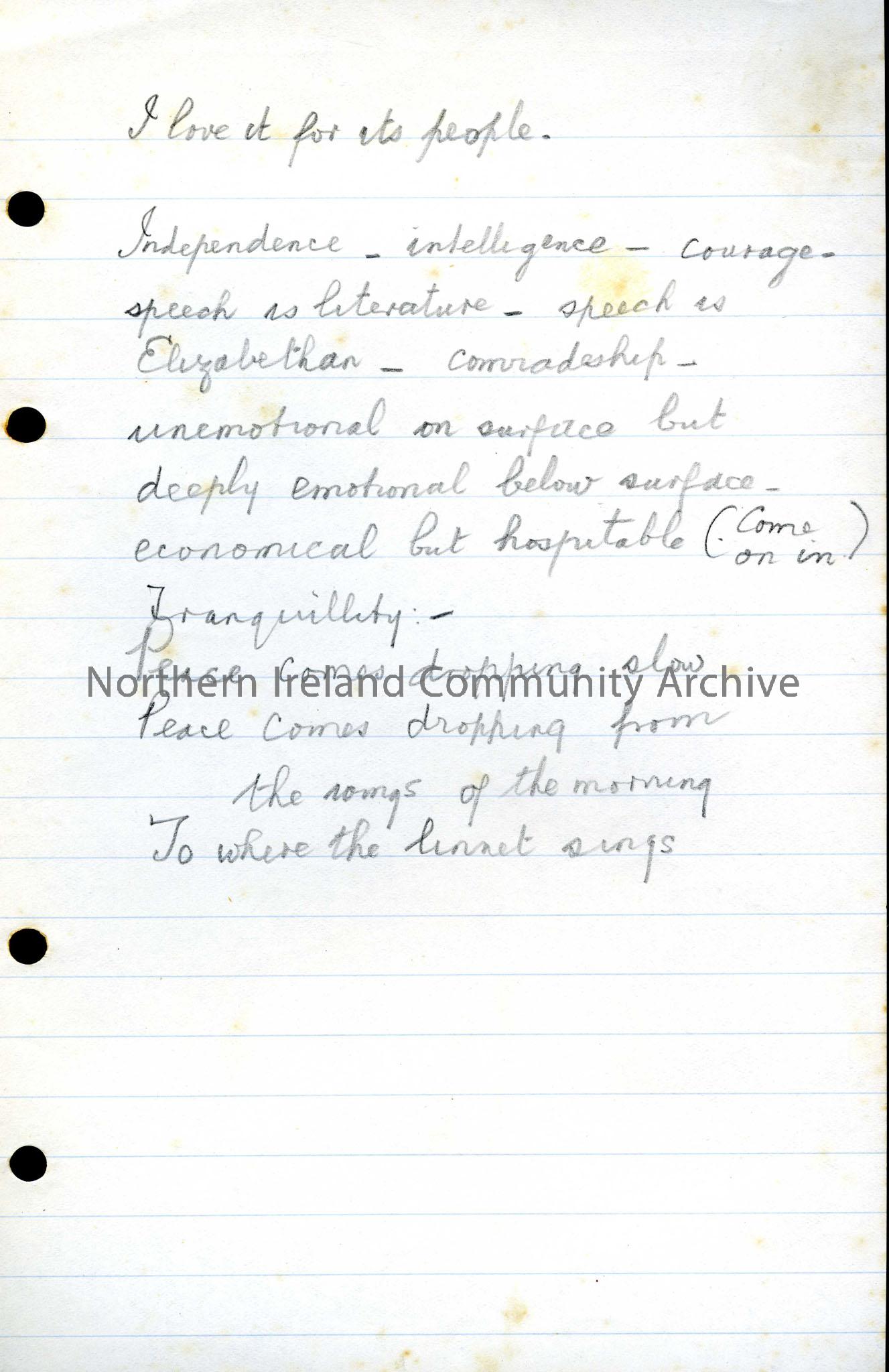 Headed "I love it for its people", in this note Sam lists what he admires about the Ulster character. He mentions the people's Independence, intelligence and courage; the Elizabethan speech; the deep emotions felt but hidden on the surface; the hospitality and the tranquillity. H e finishes by quoting from "Lake Isle of Innisfree" by W.B. Yeats, "Peace comes dropping slow"...