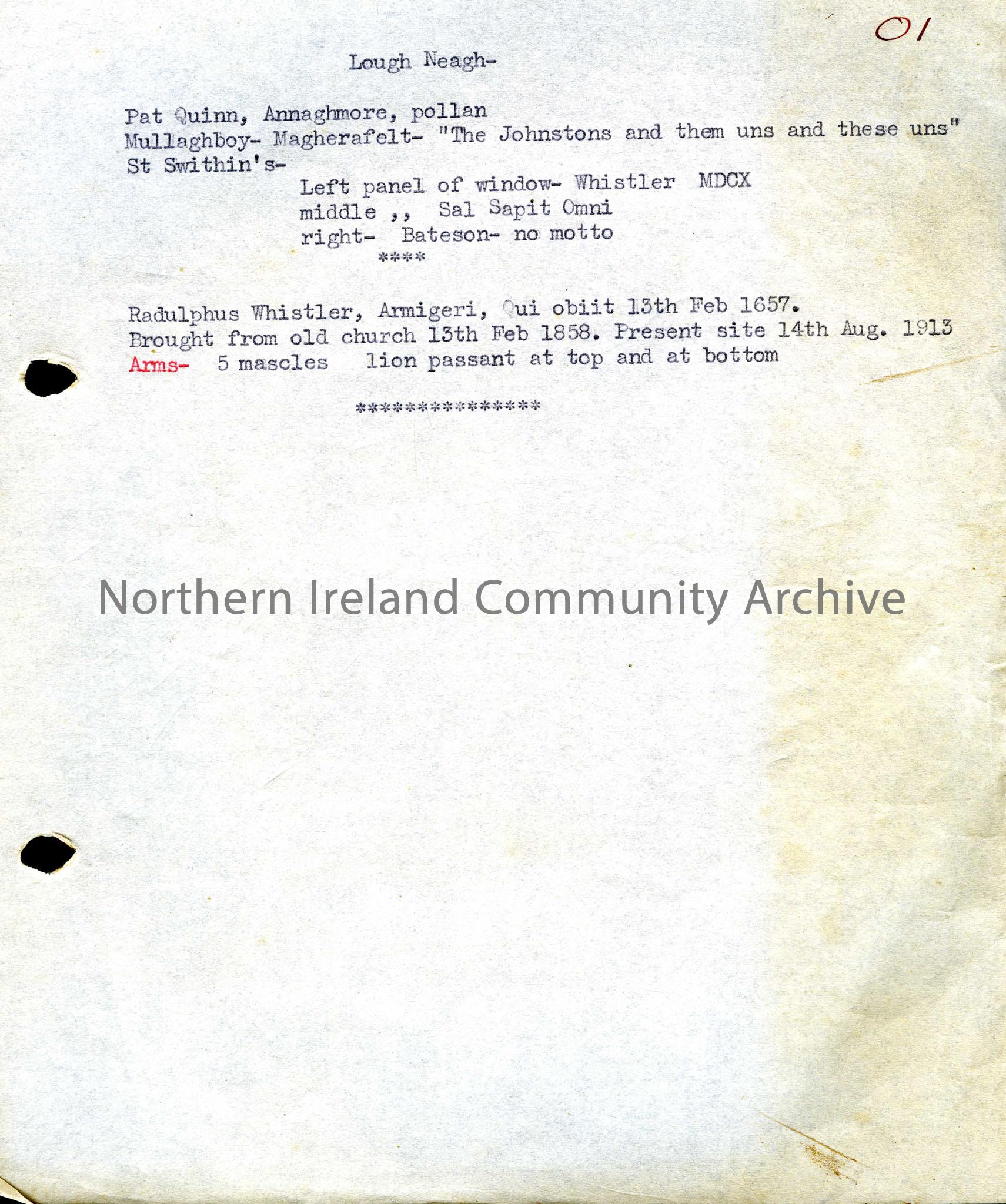 Headed Lough Neagh, the note refers to Quinns, Johnstons and Whistlers and seems to refer to a memorial window and to coats of arms