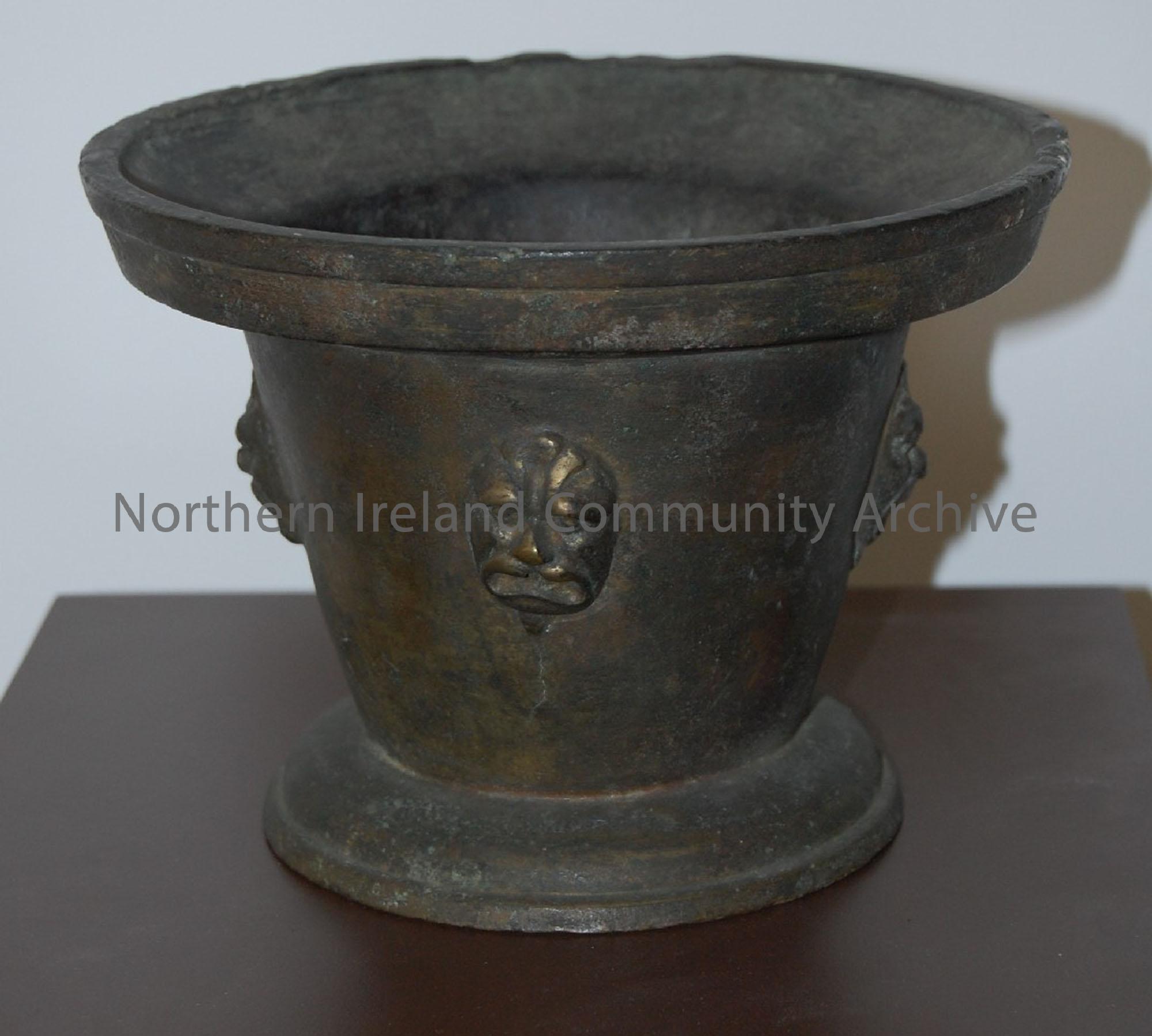 Heavy cylindrical mortar extended at mouth and base with four gargoyle like faces on the exterior.