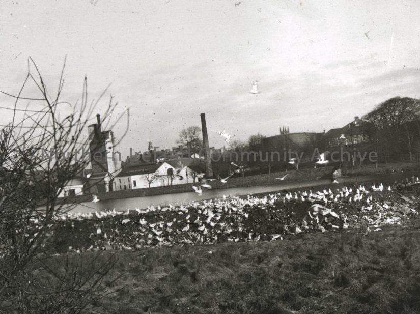 View of flock of birds feeding on River Bann surface material
