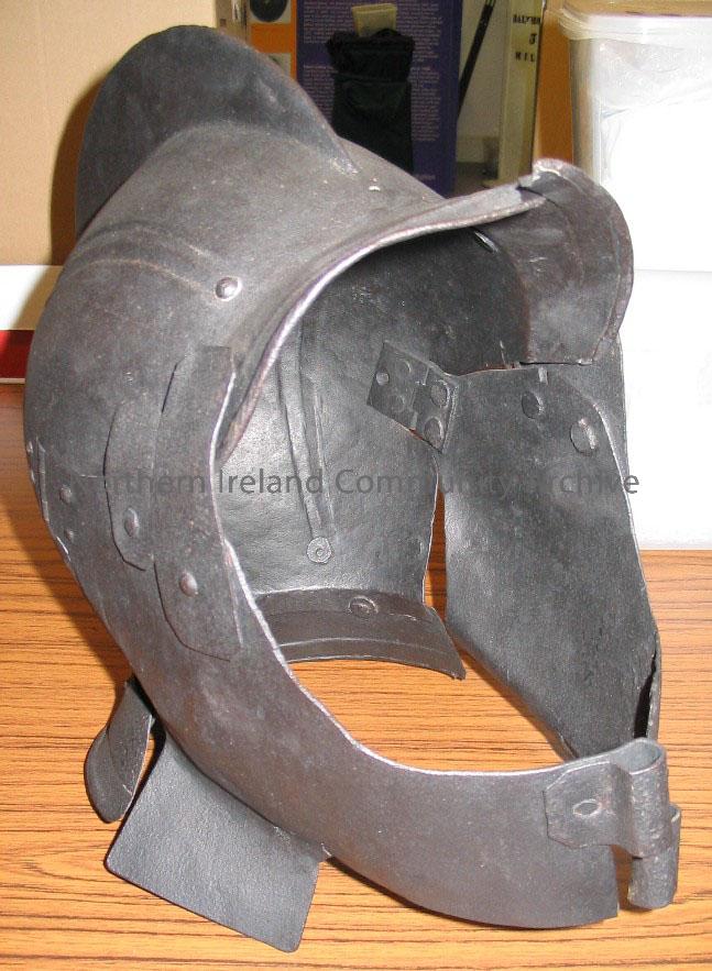 helmet. date unknown; has a hinged face guard, opening as two halves across face; a large fin extends from headpiece; restored by Ulster Museum 1992.