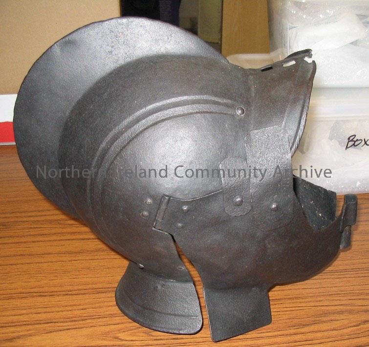 helmet. date unknown; has a hinged face guard, opening as two halves across face; a large fin extends from headpiece; restored by Ulster Museum 1992. – 1998.38 (2)