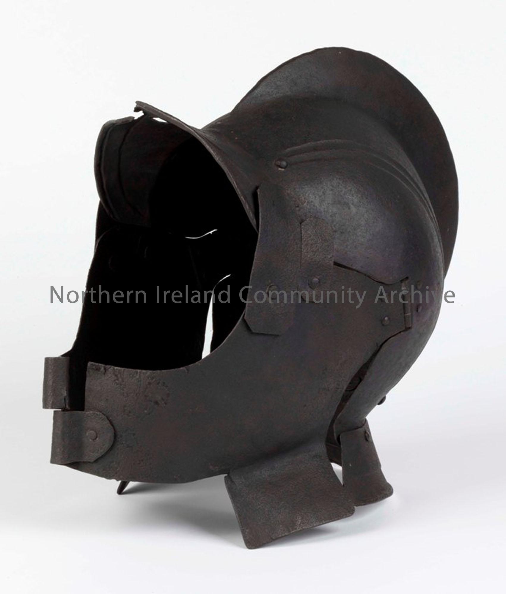 helmet. date unknown; has a hinged face guard, opening as two halves across face; a large fin extends from headpiece; restored by Ulster Museum 1992.