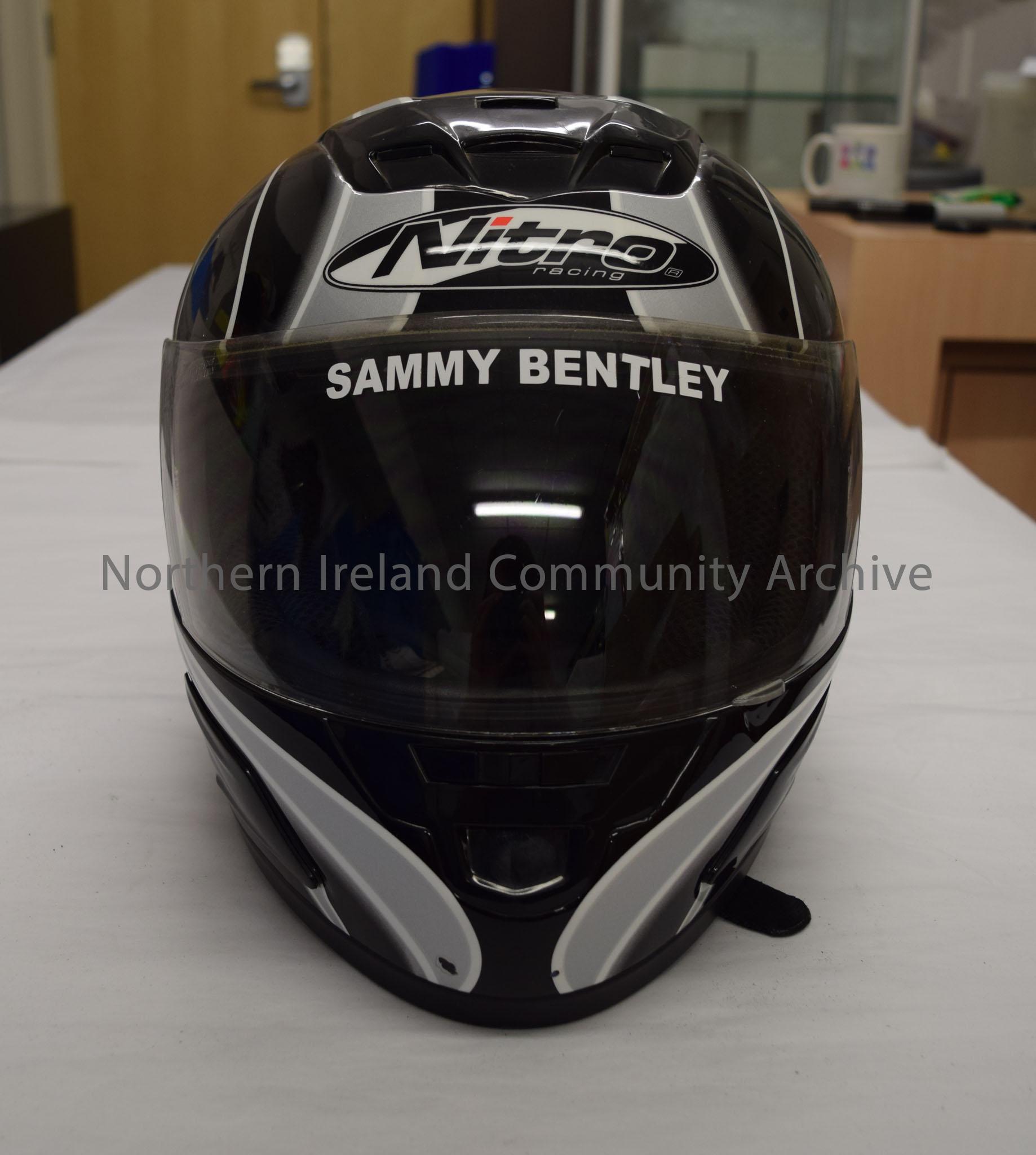 Helmet with Sammy Bentley written on it. Black with white and silver/grey art. Nitro Racing helmet. – 2016.33 (2)