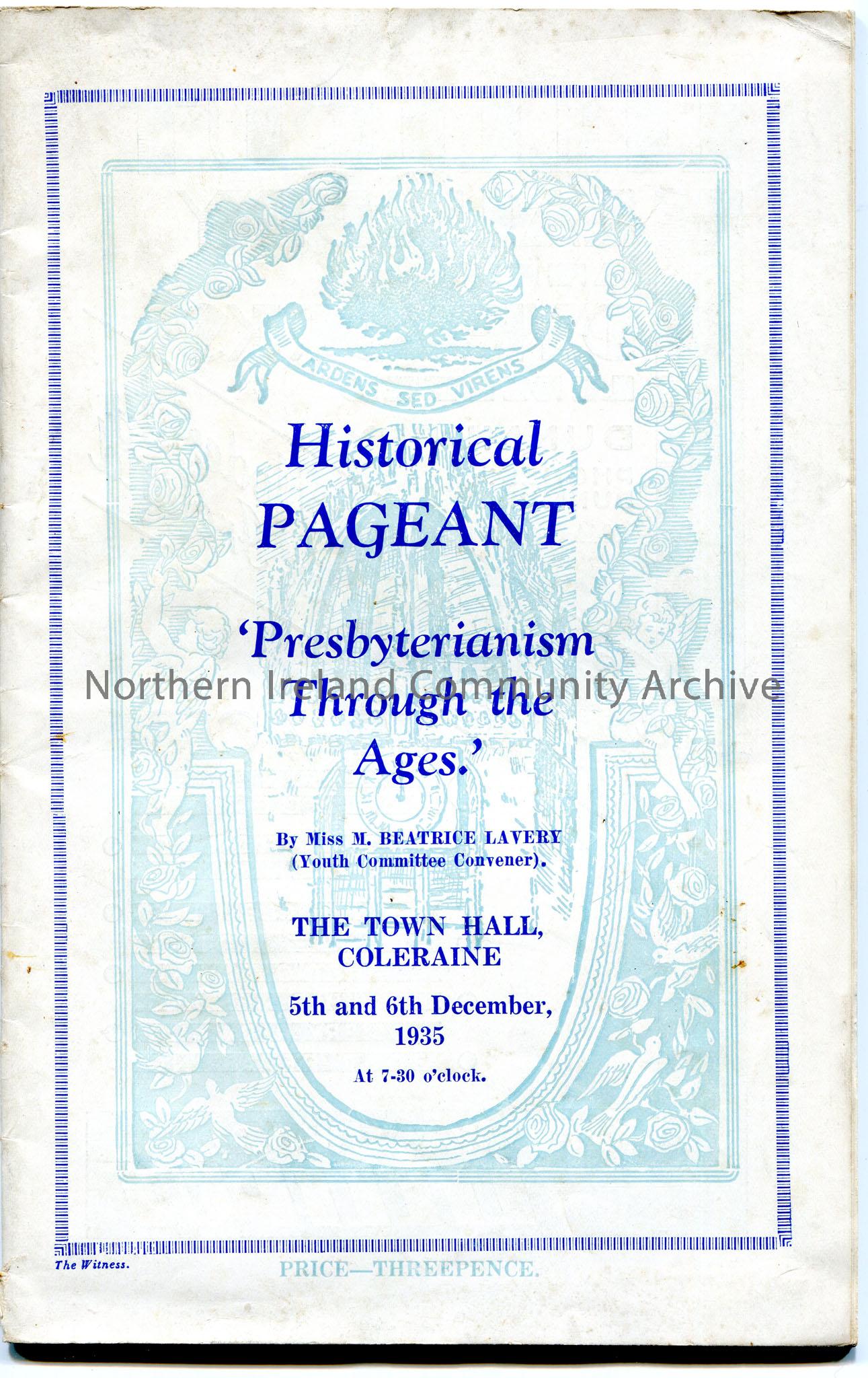 ‘Historical Pageant. ‘Presbyterianism Through the Ages”. By Miss M. Beatrice Lavery (Youth Committee Convener). At ‘The Town Hall’ Coleraine on 5th a…