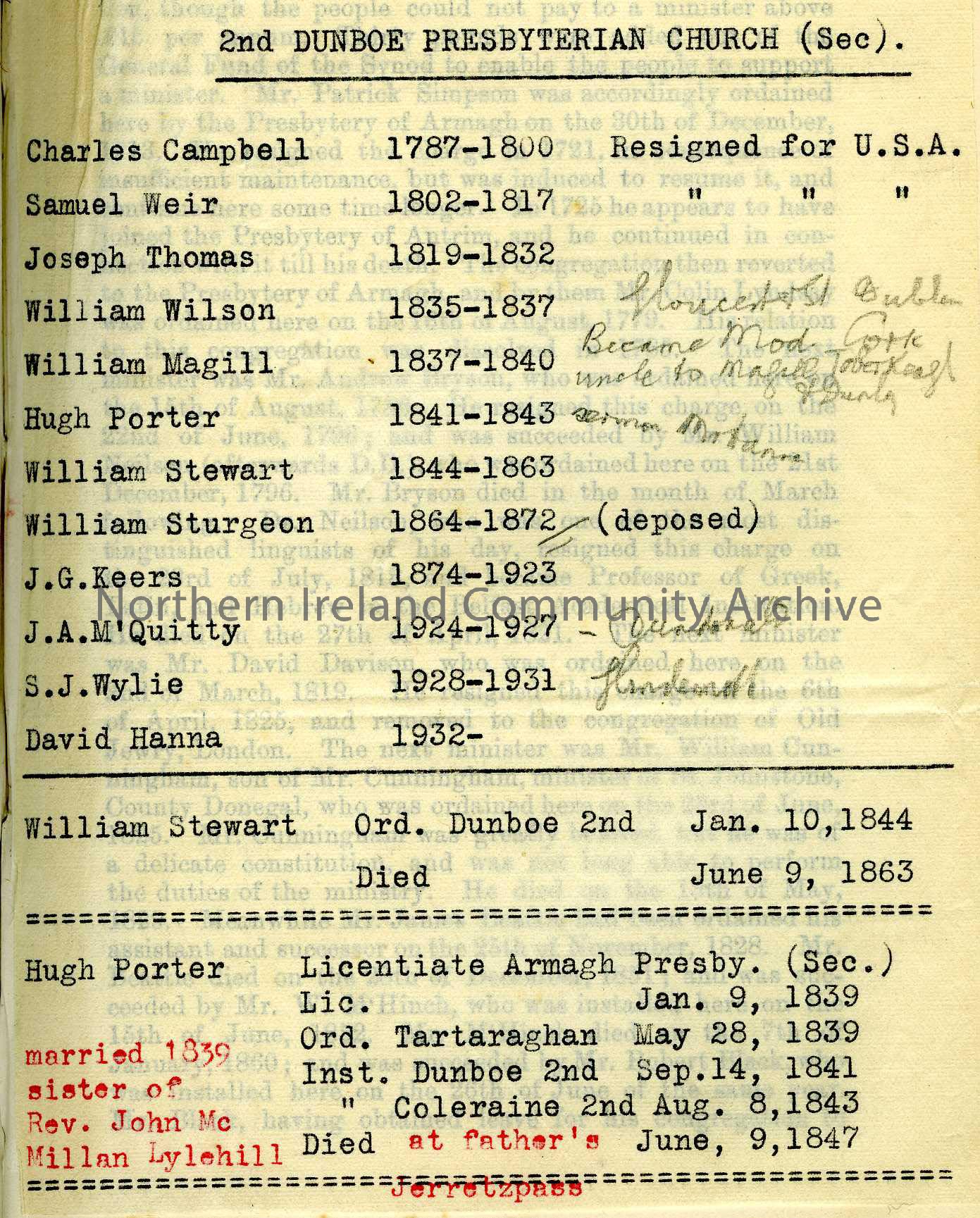 History of Congregations of the Presbyterian Church in Ireland - includes biographical notes on eminent ministers and laymen. Many typed and handwritten inserts affixed to various pages - see attached images - as well as loose ones under separate entries.