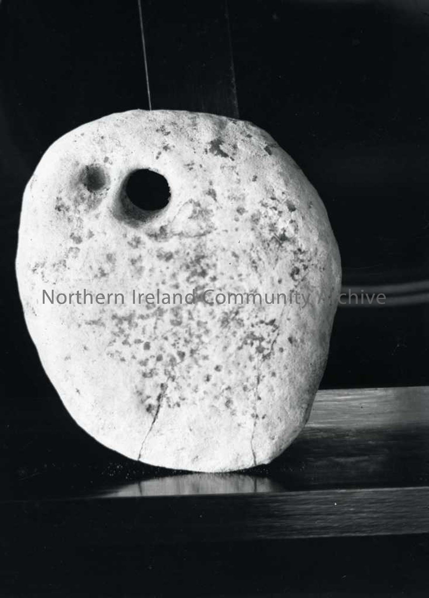 Photograph is printed in a newspaper article and is referred to as a white stone found during excavations at Mountsandel, Coleraine