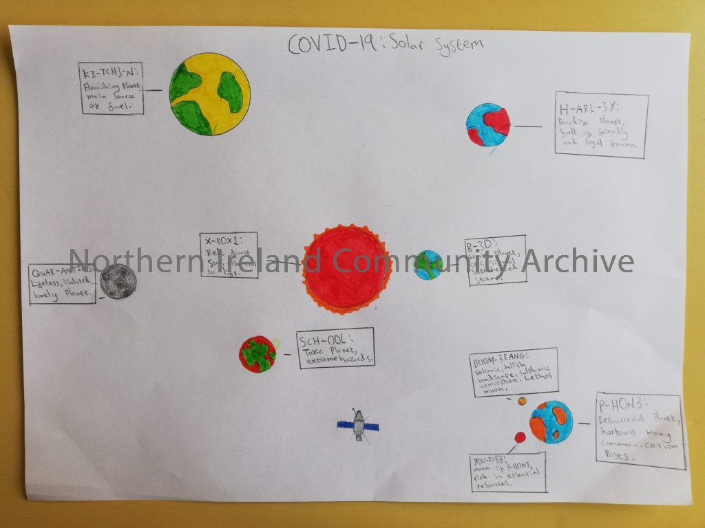 “I got the kids to make a map of their experience of the pandemic … Conor in particular really grasped the idea. He did one as a solar system inspired by his favourite Xbox game at the moment, One Man Sky. You’ll see that ‘homeschool’ is a dark a toxic planet on the outer reaches of his interest!”
