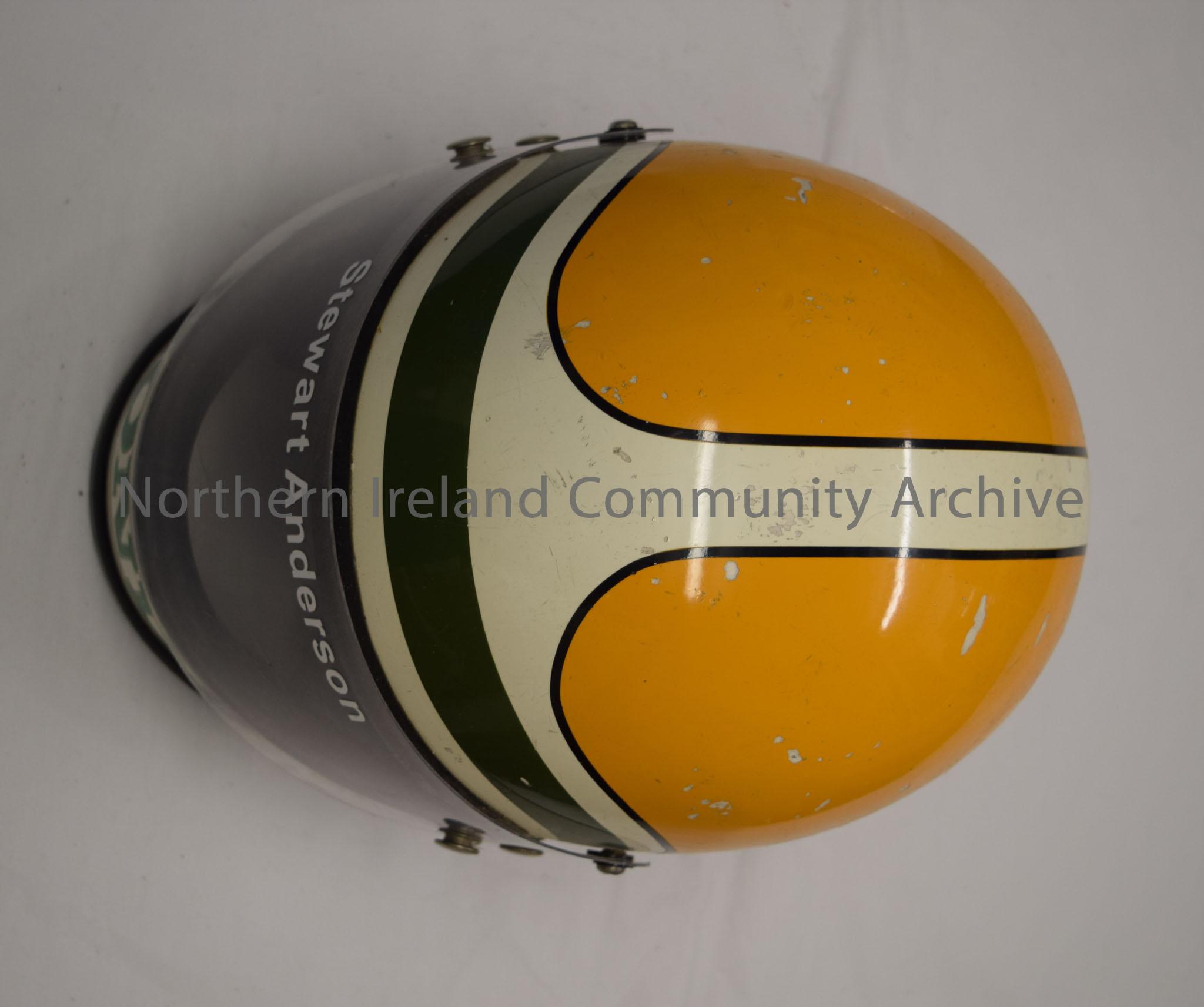 Honda motorcycle helmet belonging to Stewart Anderson. White helmet with green stripe and yellow back and sides.