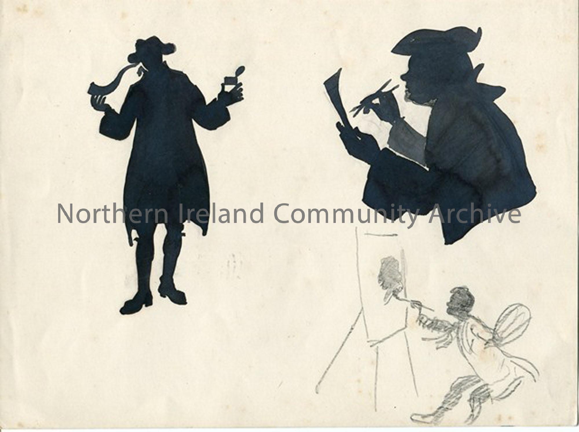 Hugh Thomson artwork titled, 2 silhouettes and pencil sketch on same piece