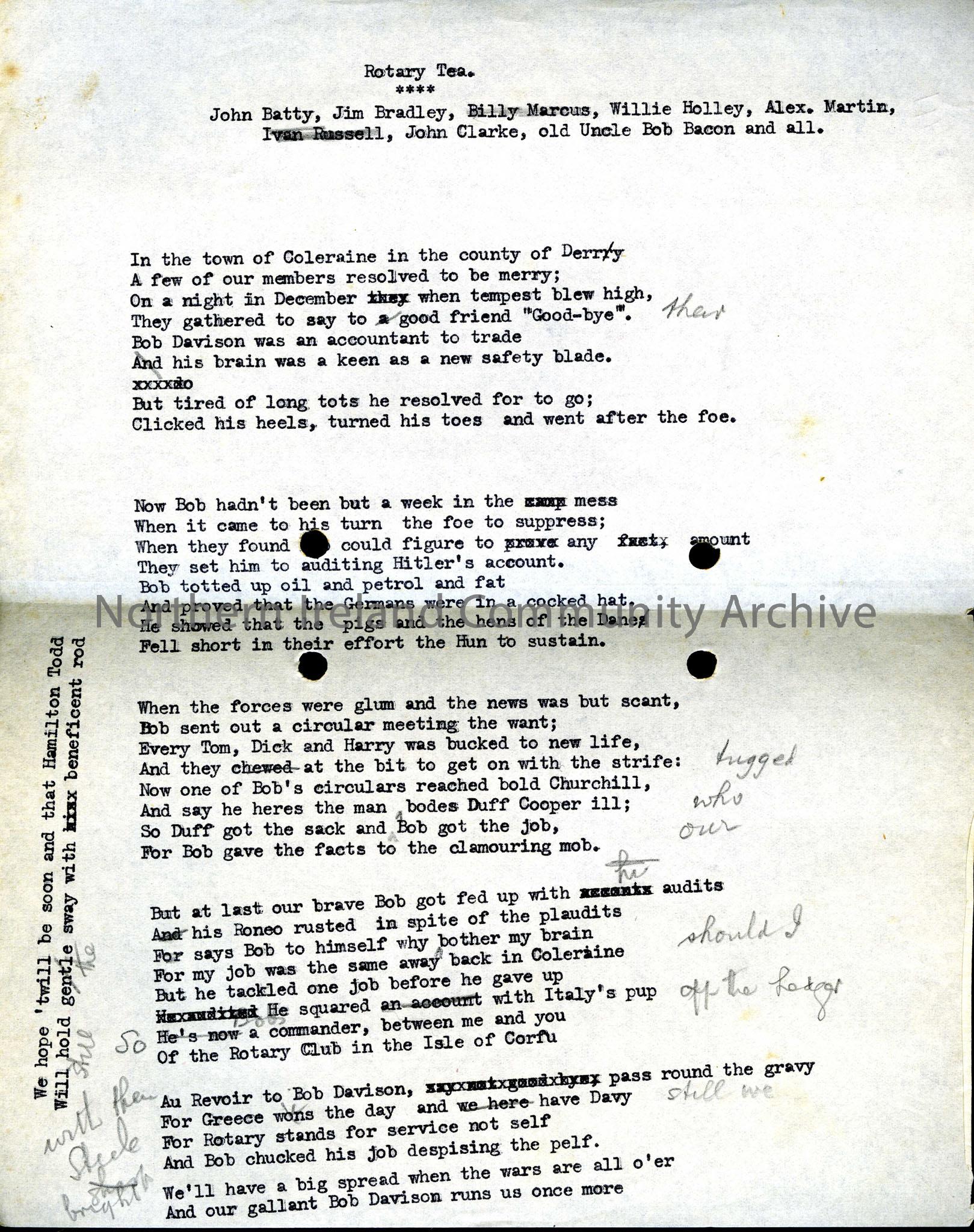 Humerous poem entitled “Rotary Tea” about Bob Davison, a Coleraine accountant .