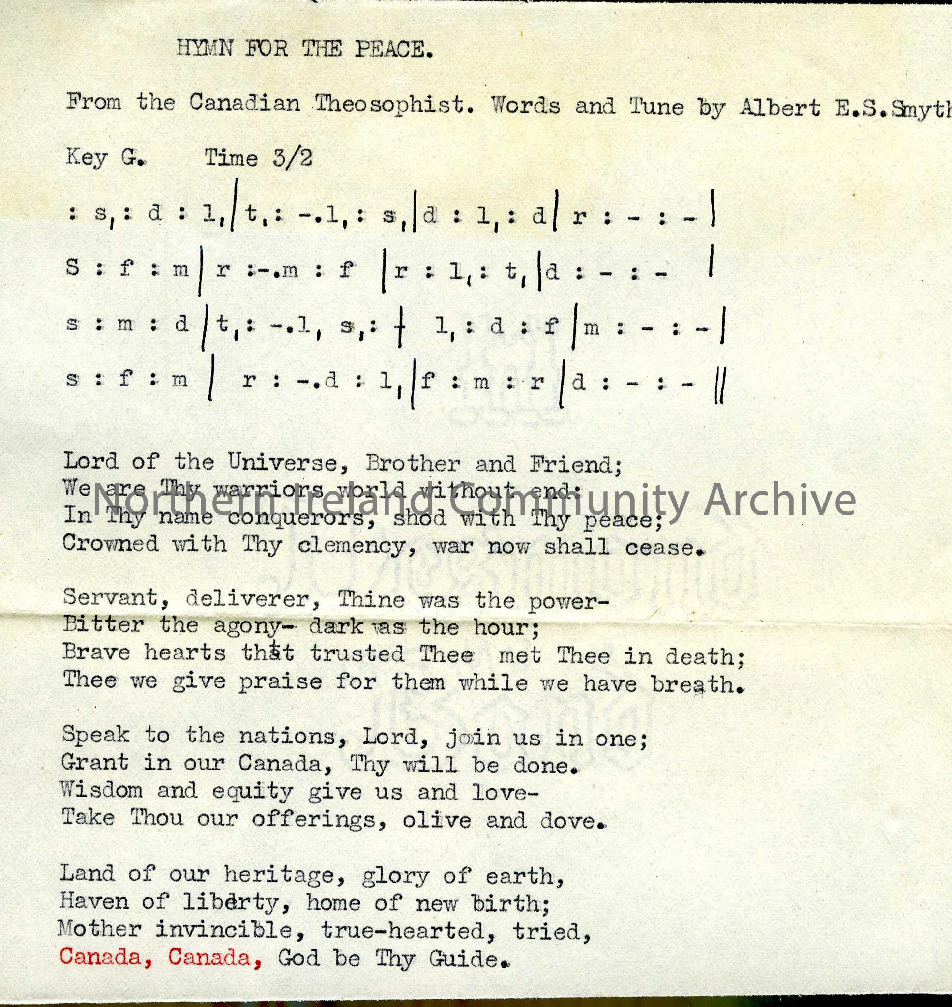 Hymn for the Peace - typed words and music notation by Albert E S Smythe