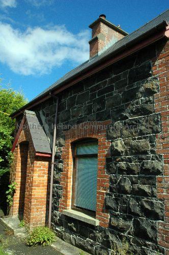 Black two storey house in Stranocum built of imported basalt owned presently by J Esdale but originally used as an ice house and storage for game for the Hutchinson Estate.