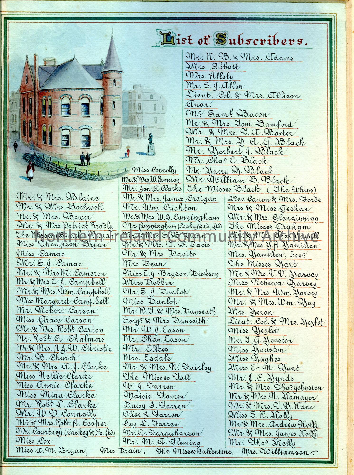 Illuminated "Address and Presentation" dated April 1924, presented to Miss Hamilton by members of the Portrush Urban District Council and the people of Portrush. Miss Hamilton was a member of Portrush Urban District Council, chairman for five years. Features watercolour painting of Portrush town hall. Three black and white photographs re Portrush inside the address.