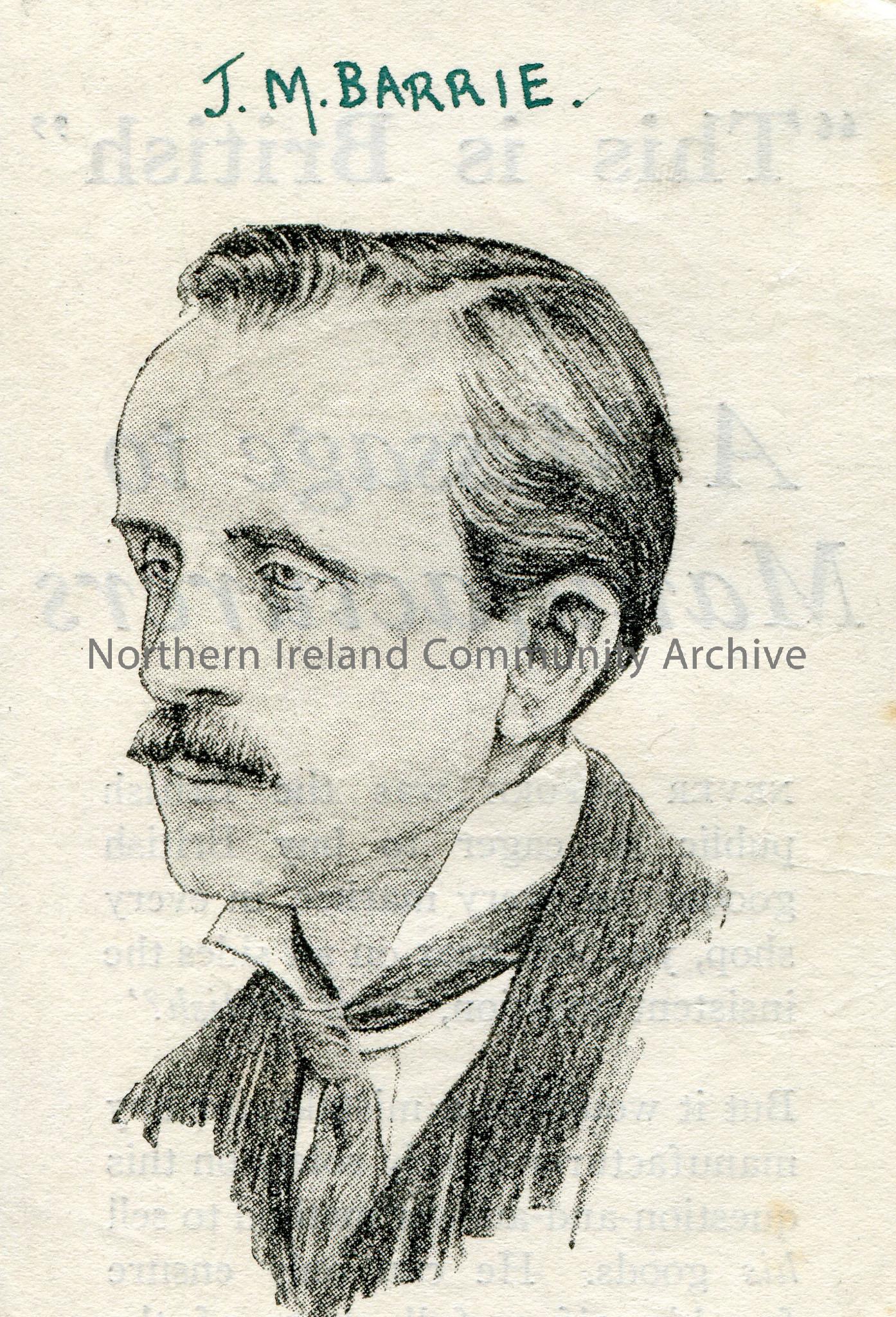 Illustration cut from most likely a newspaper or other publication. Portrait image of a man wearing a suit. Titled, ‘J. M . Barrie’ in ink written at …
