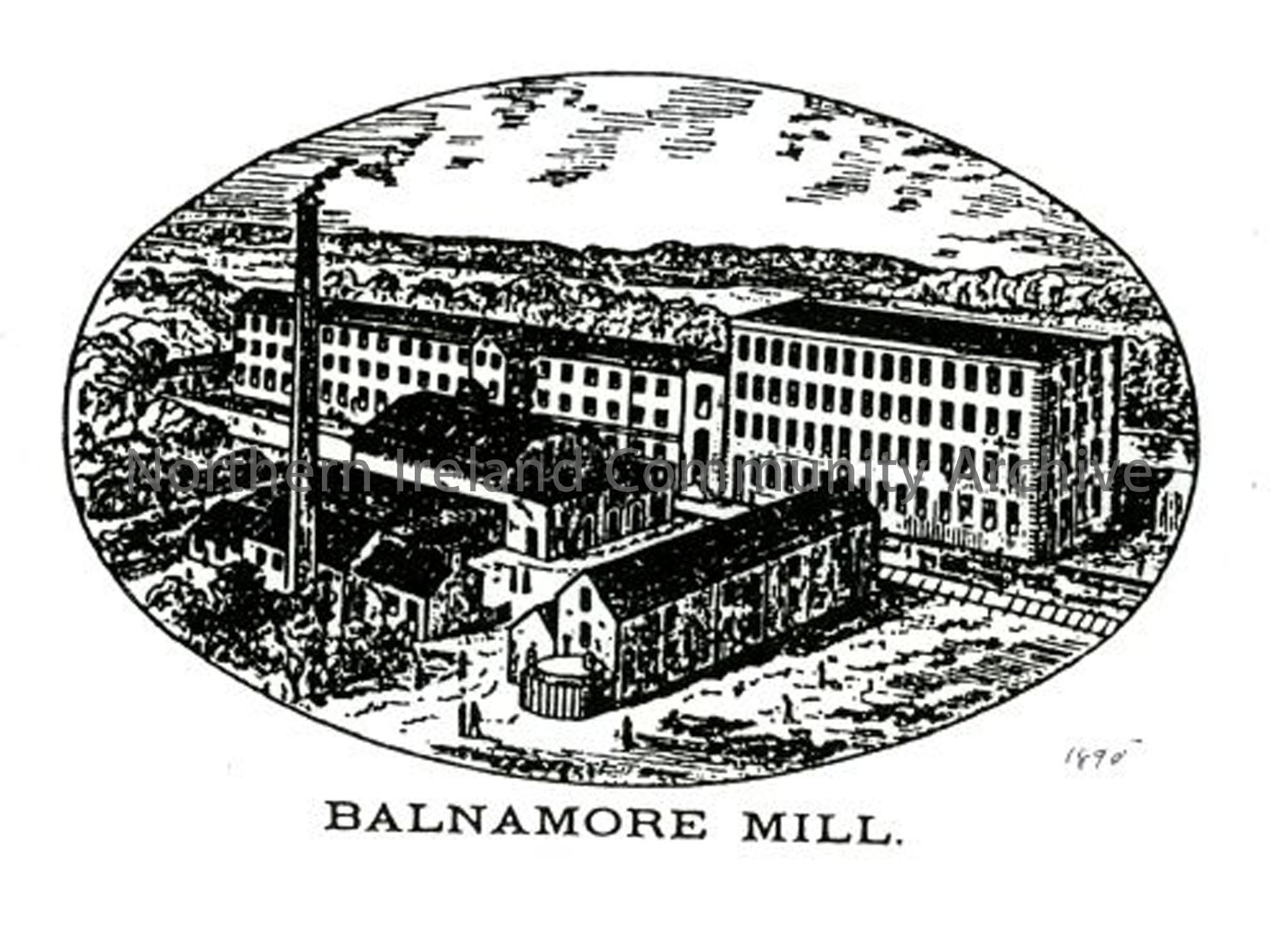 Illustration of Balnamore Mill from Bassett's Tour of Ireland 1888. Note the top storey and peaked roof of the new mill have not yet been added and the old mill still has three storeys.