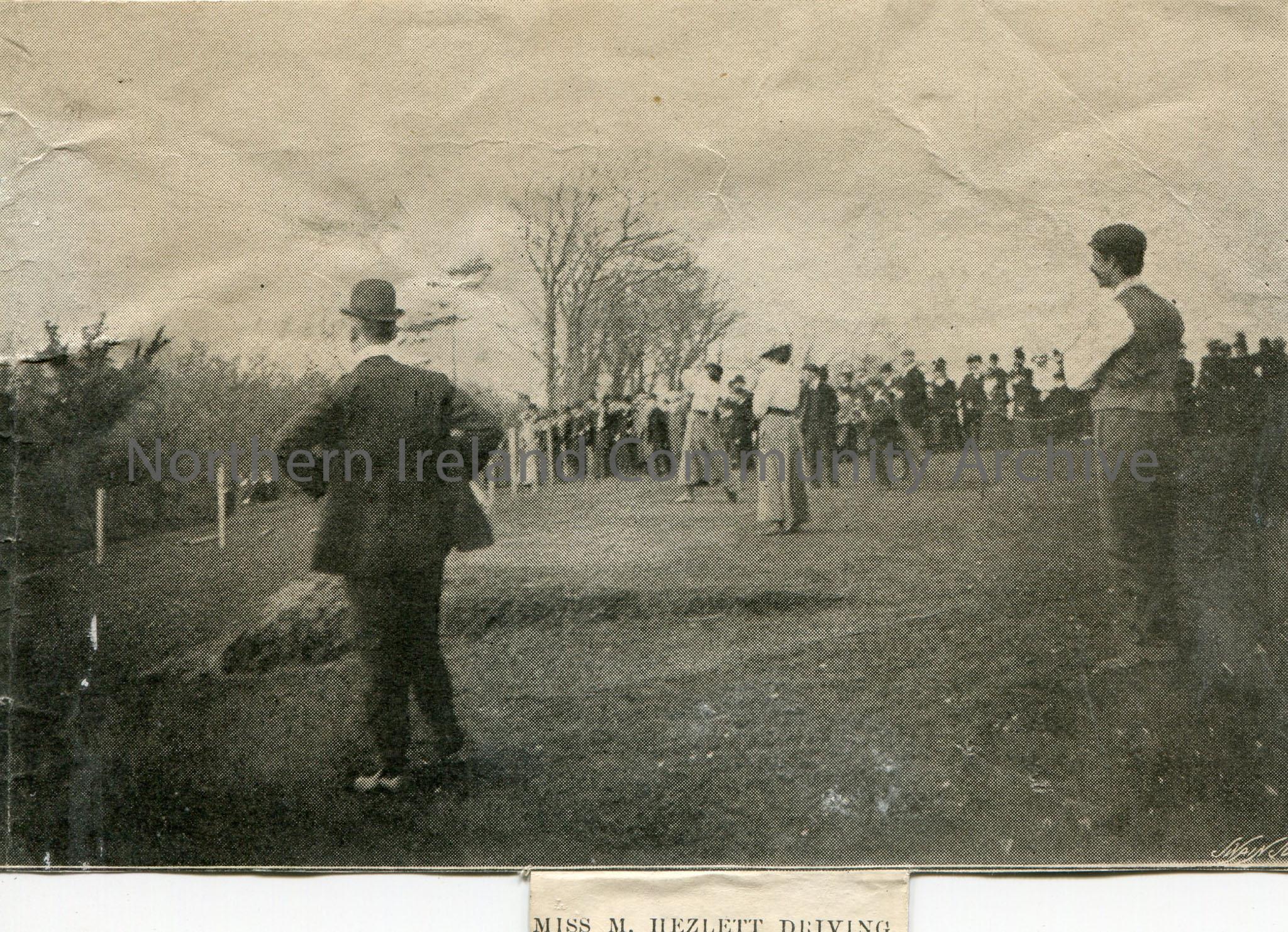 Image cut from a newspaper women playing gold with a crowd watching. Captioned, ‘Miss M.Hezlet Driving’.