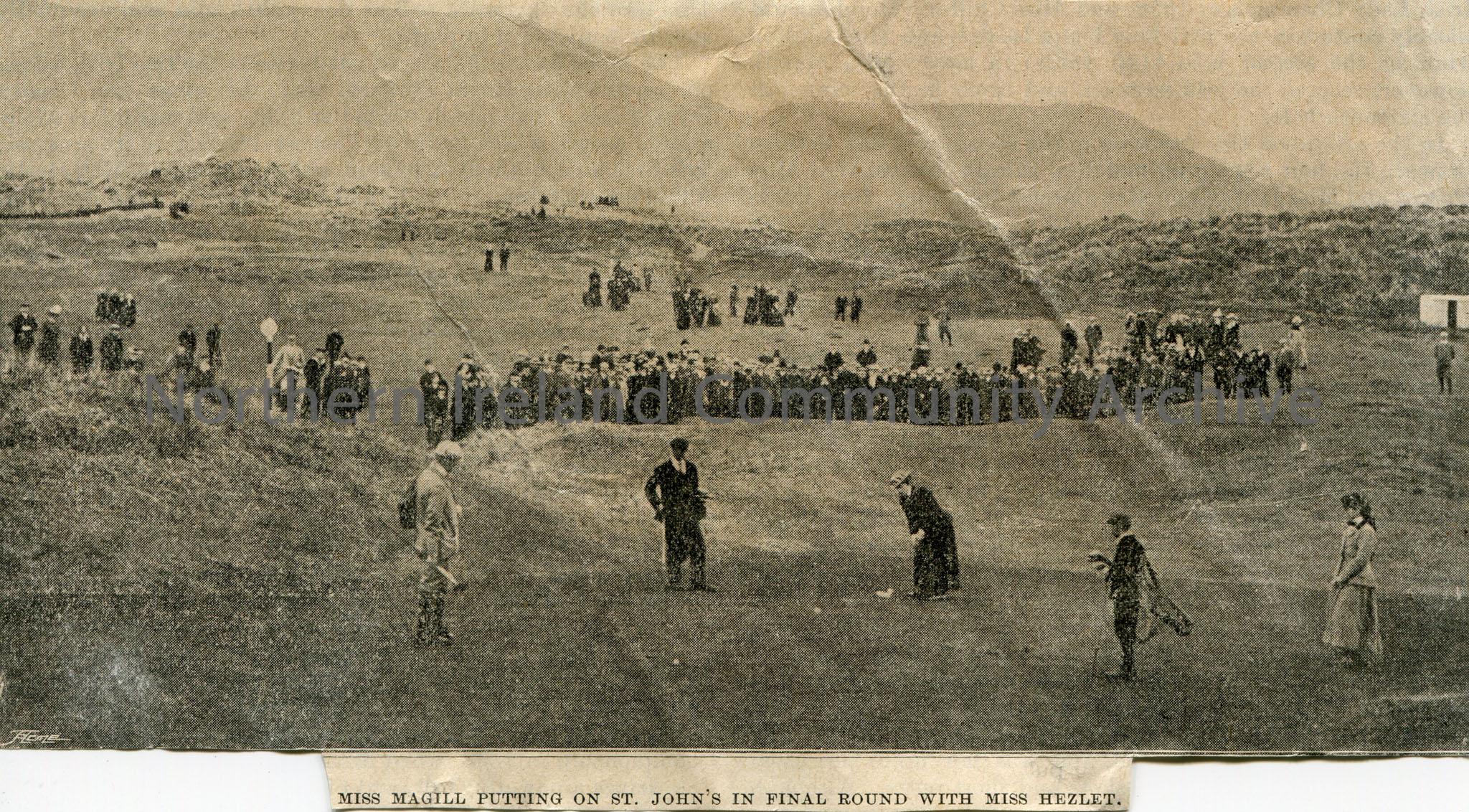 Image cut out from a newspaper of ladies playing golf captioned, 'Miss Magill putting on St.John's in final round with Miss Hezlet'. Part of an article on back of image refers to a golfing game which mentions Miss Hezlet and Miss Magill.