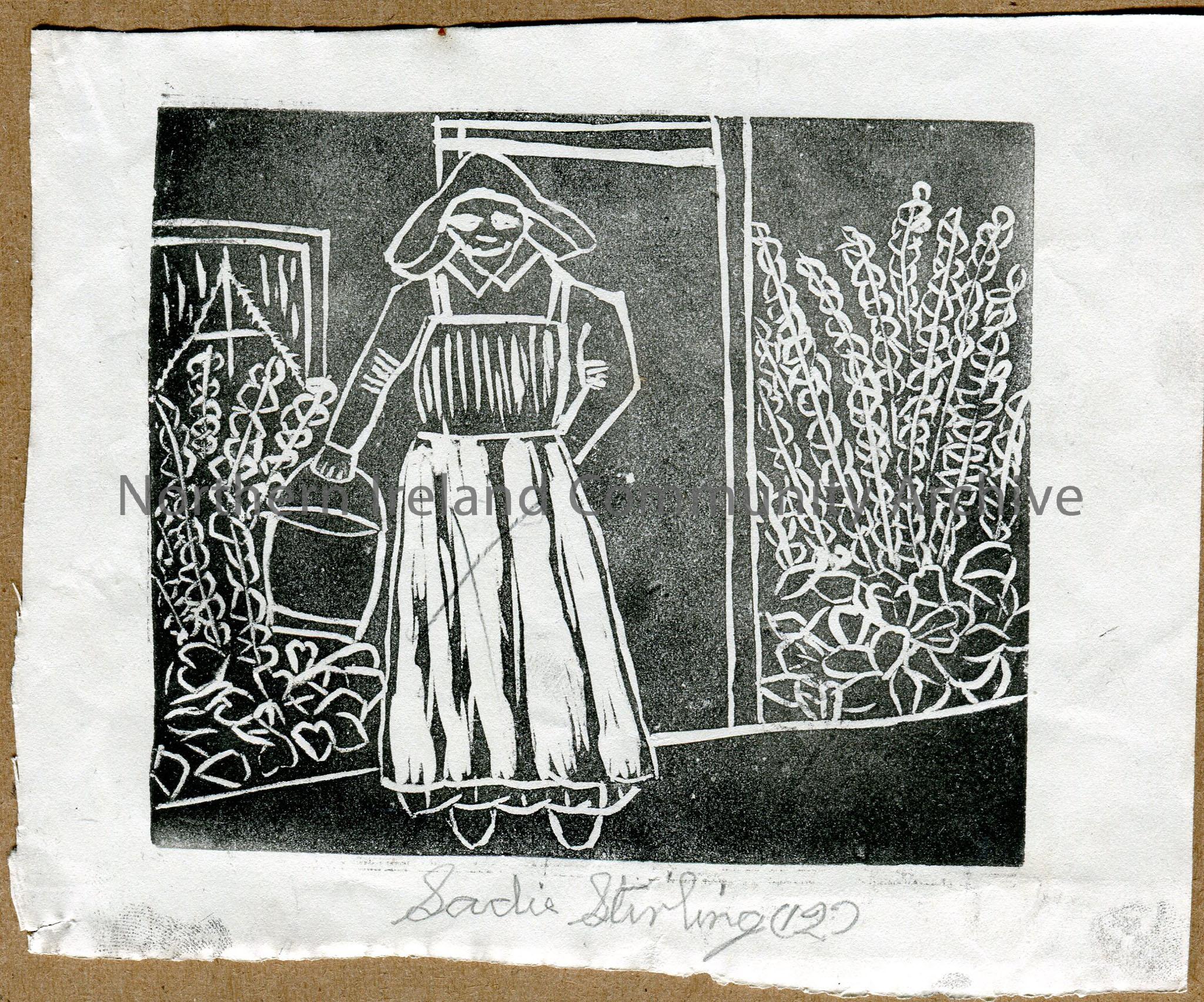 Image of a woman holding a bucket outside a doorway. ‘Sadie Stirling (12)’ handwritten in pencil below image. Image black and white.