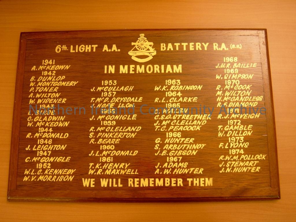 in memoriam wooden board with stand attached on back. For the 6th Light A A Coleraine battery RA (SR). We Will Remember Them, it records the names of the veterans that served and the years they died from 1941- 1974 in gilt (1981)