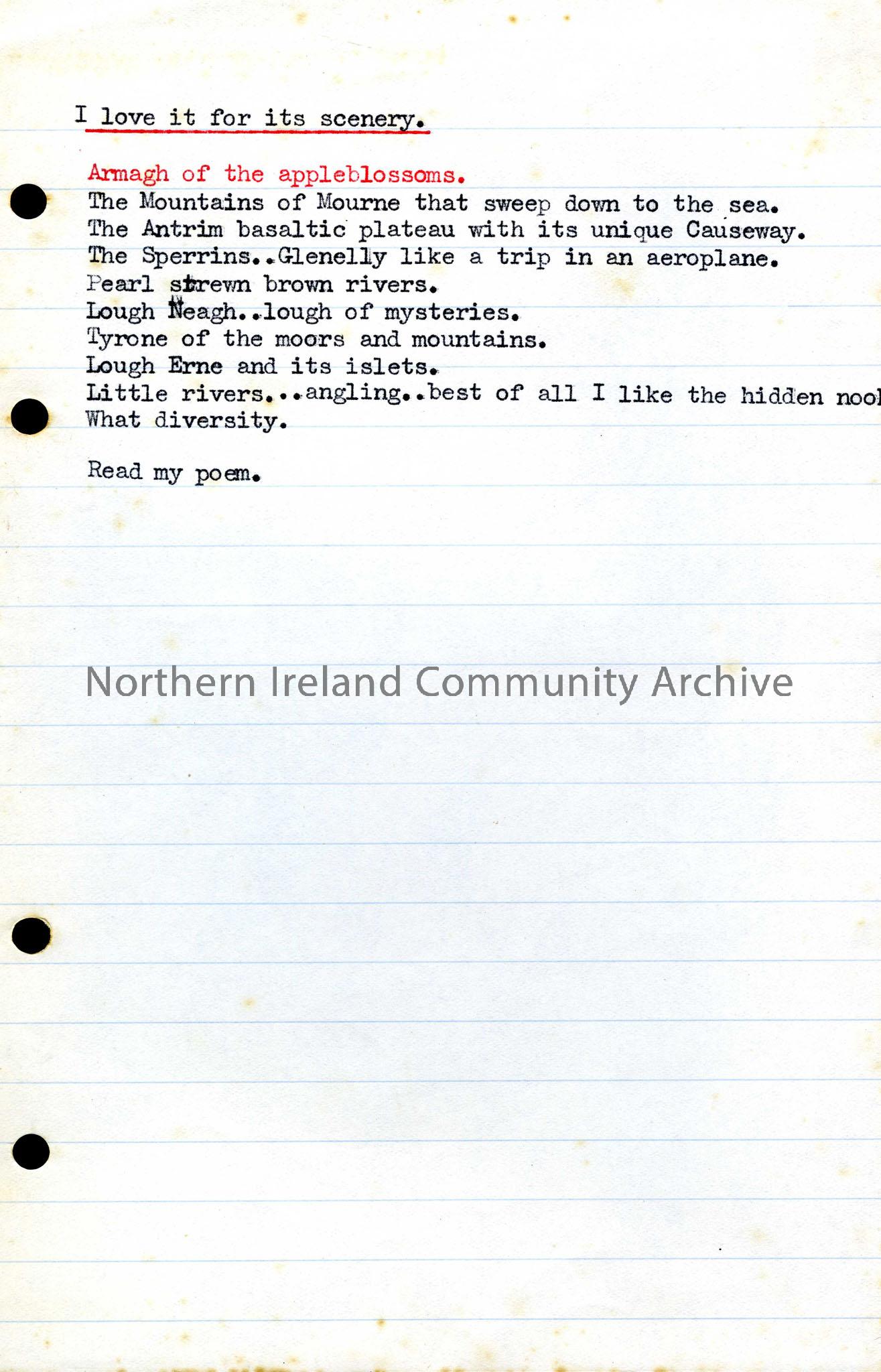 In this note headed "I love it for its scenery", Sam Henry has described some of the things he loves about the Ulster landscape. It may be the opening to a talk as underneath he has written, Read my poem".