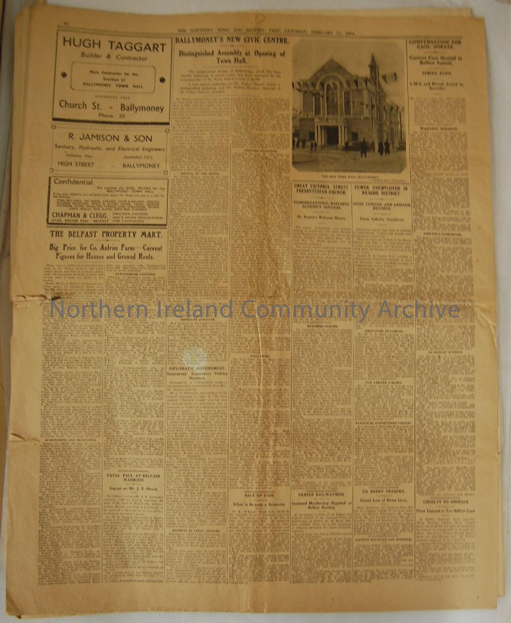 Includes adverts, entertainment, sport, pictures of Presbyterian Assembly, Luncheon at Town Hall after opening, speeches after the opening, the Balmoral Show, dredging the Lagan for a body (!), outside the new Town Hall (p.10), article on Ulster Radio, 'hints on how to prevent skidding, and driving through fog' p.3