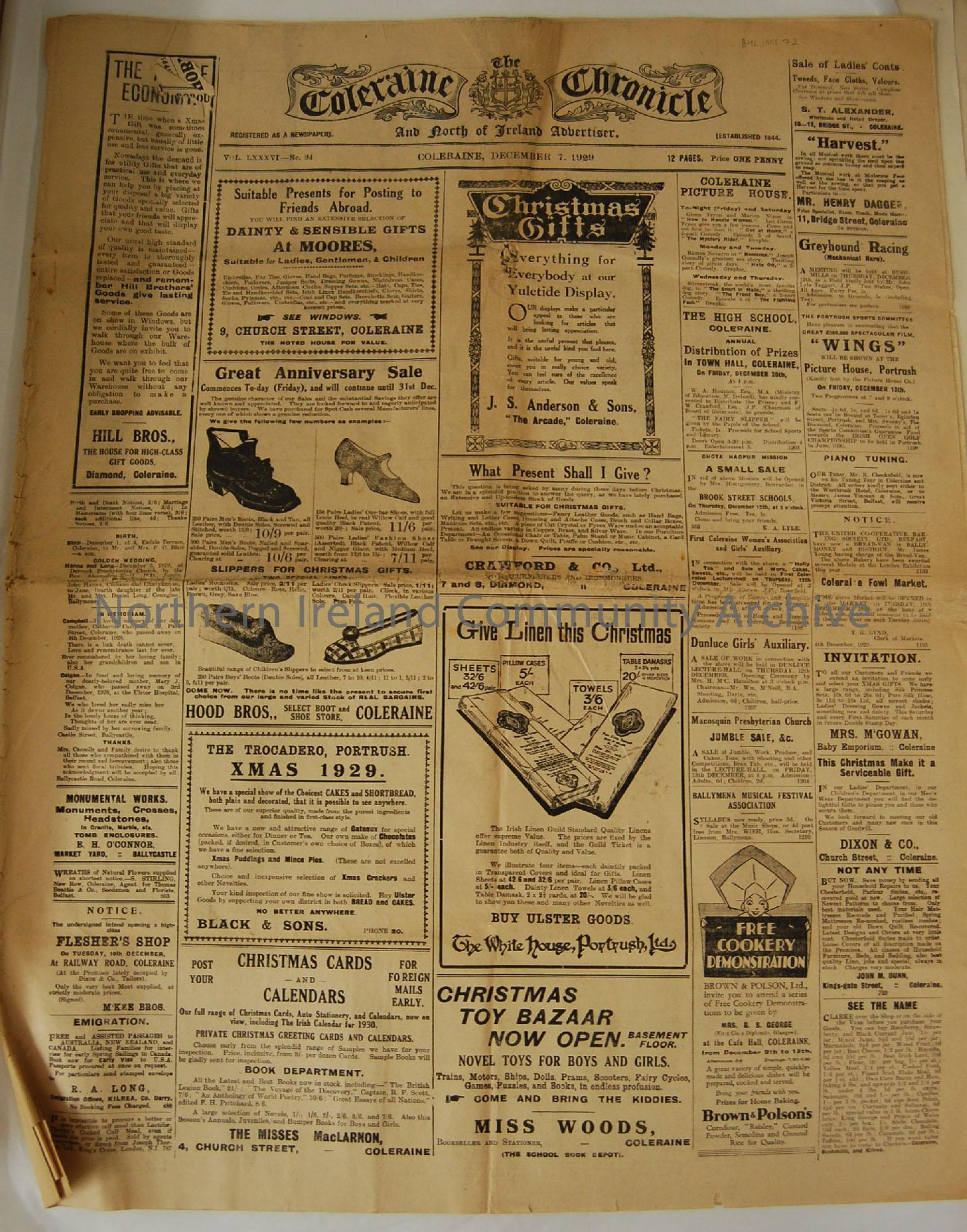 Includes entertainment details, adverts etc, sport, and 'The Toomebridge Murder' (a postman), 'Carnlough man found dead', and a woman accused of murdering her baby