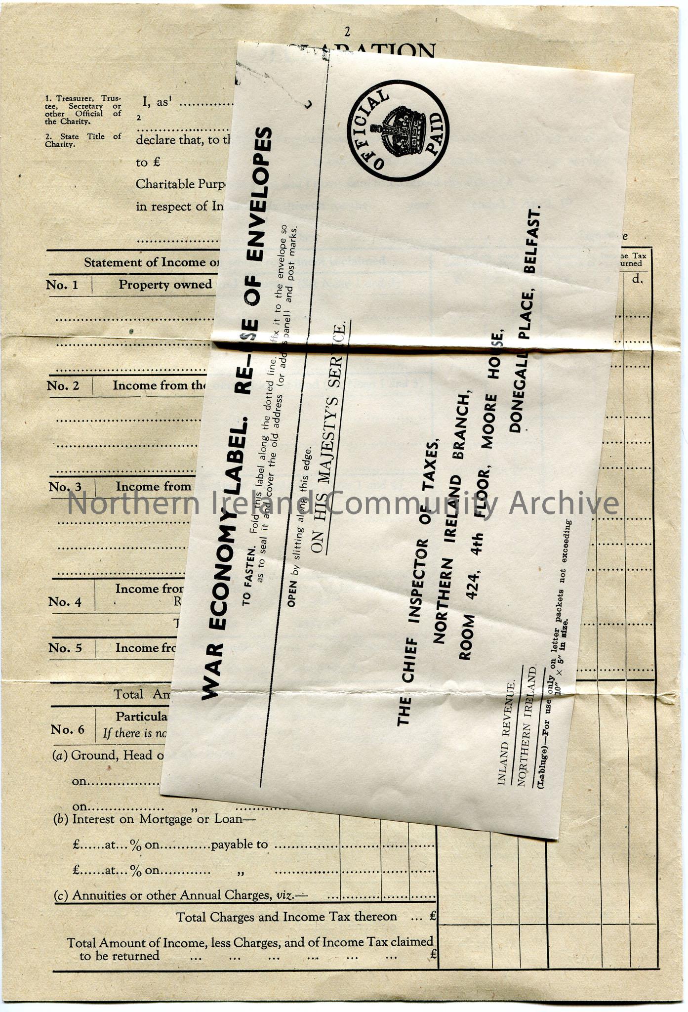 Income Tax Repayment Claim form. In booklet form. 'Rice Bequest, Coleraine, Killowen and Portrush' written on top of form. Reference No X388. Last repayment to November 1945. War economy label for reuse of envelopes stuck to inside page.