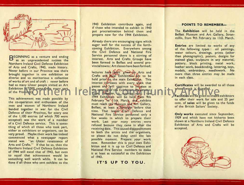 Information leaflet about the Civil Defence Arts and Crafts Exhibition which ran from 9th February to 11th March 1944 in Belfast Museum and Art Gallery, Stranmillis. Folded in three.