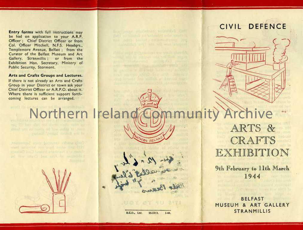 Information leaflet about the Civil Defence Arts and Crafts Exhibition which ran from 9th February to 11th March 1944 in Belfast Museum and Art Gallery, Stranmillis. Folded in three.
