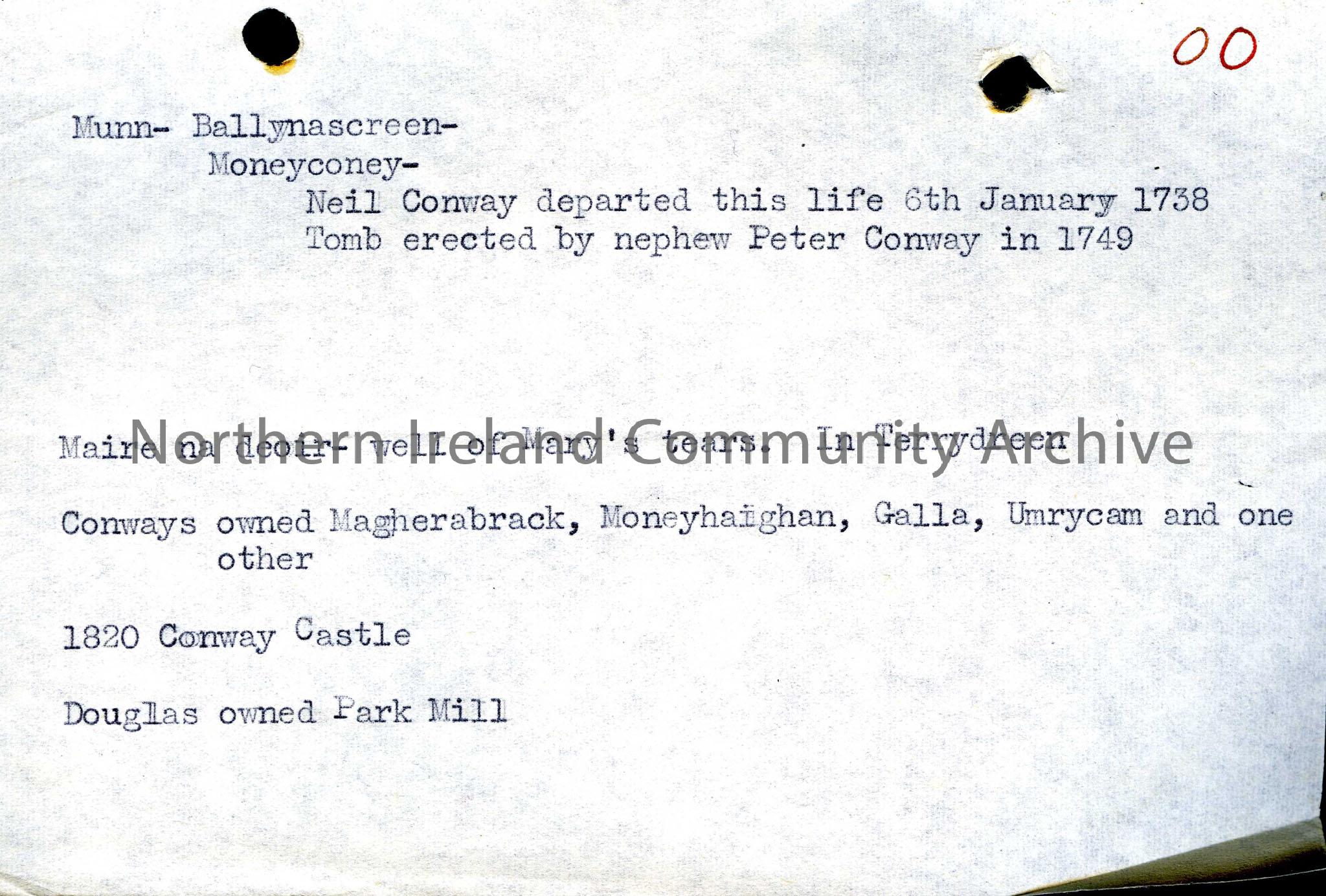 Information on the Conway family of Ballynascreen including gravestone inscription for Neil Conway who died 6.1.1738