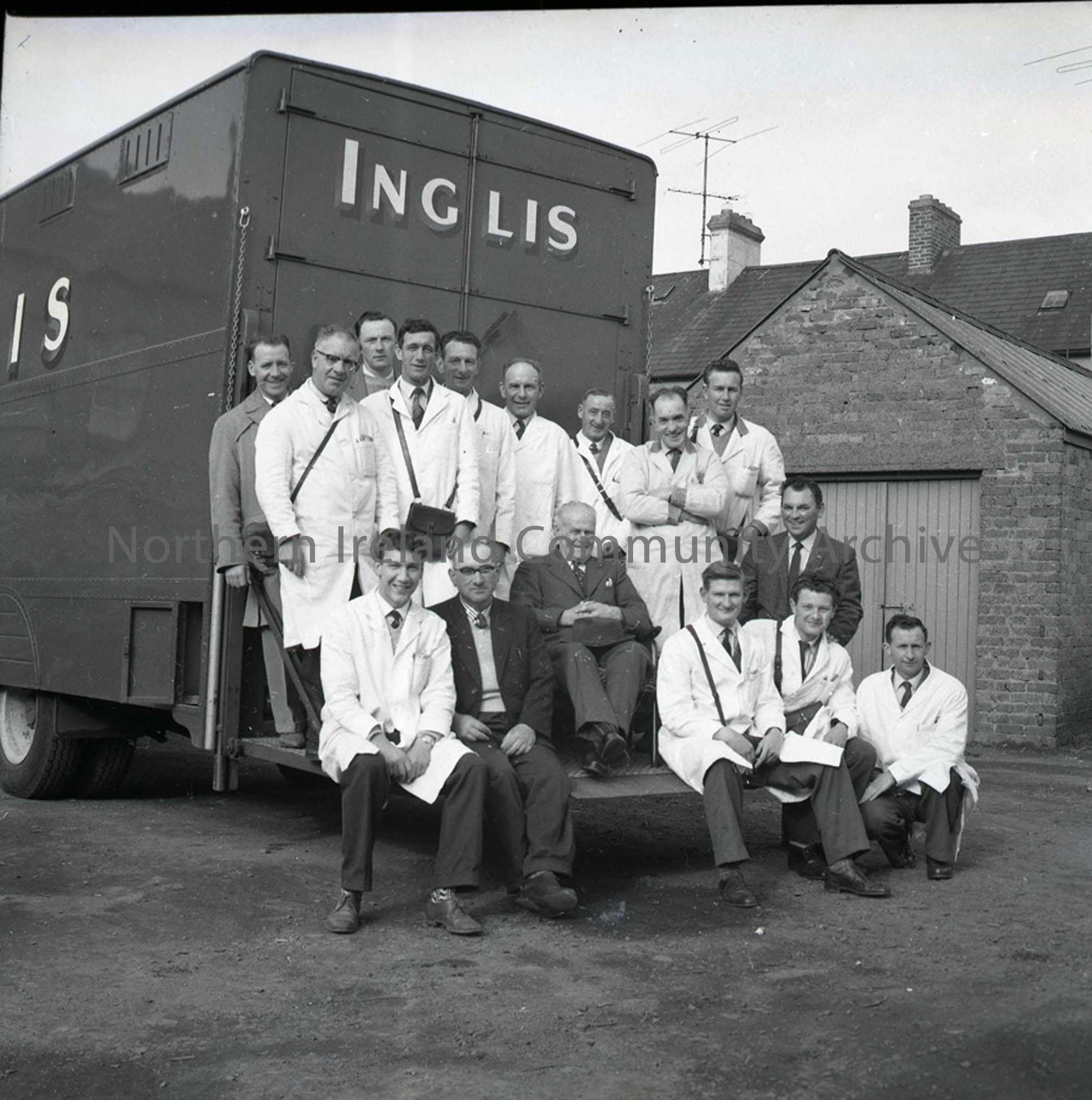 This photo was taken in 1963 to celebrate the retirement of Mr. Maxie Ellis who, for fifty years, had delivered bread from the Inglis headquarters in Belfast to the Coleraine depot. The depot was located between Ballycastle Road and James Street.