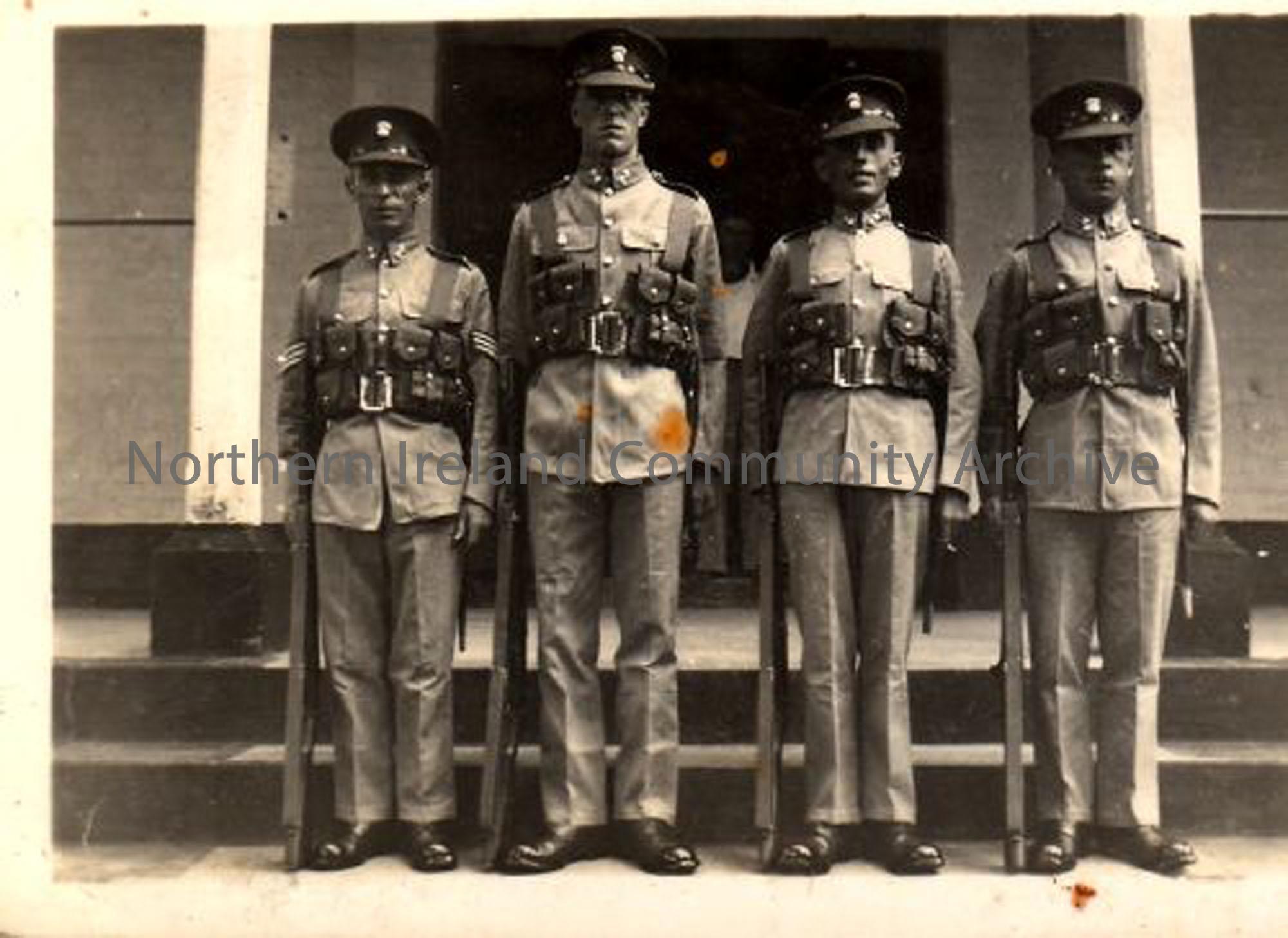 Inniskillen Fusiliers, on the far left is Sergeant Charlie Moore, c.1938. They are wearing desert fatigues. The photograph was probably taken in the Palestine Protectorate.