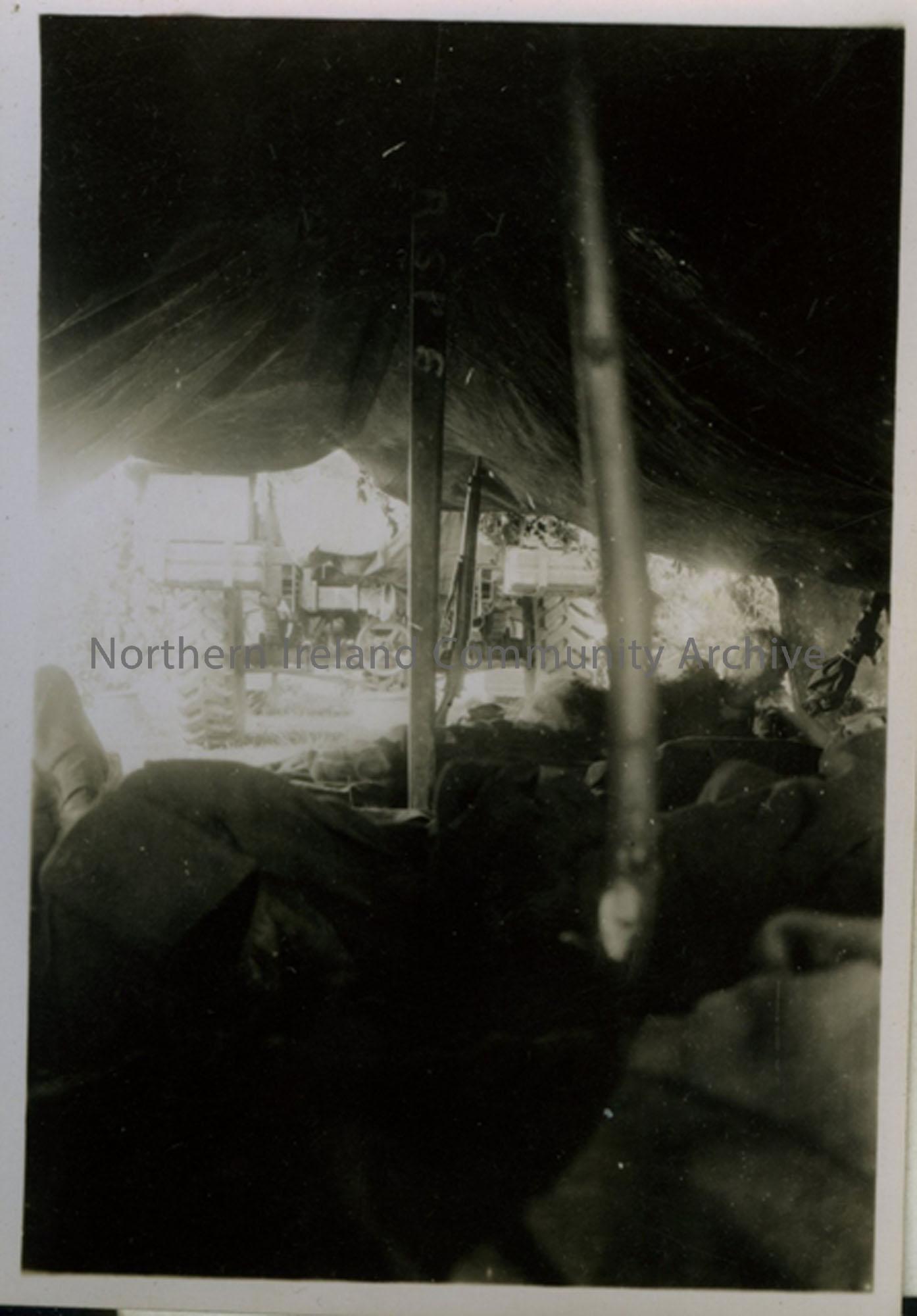 View inside a tent looking outwards to the wheels of an army vehicle.