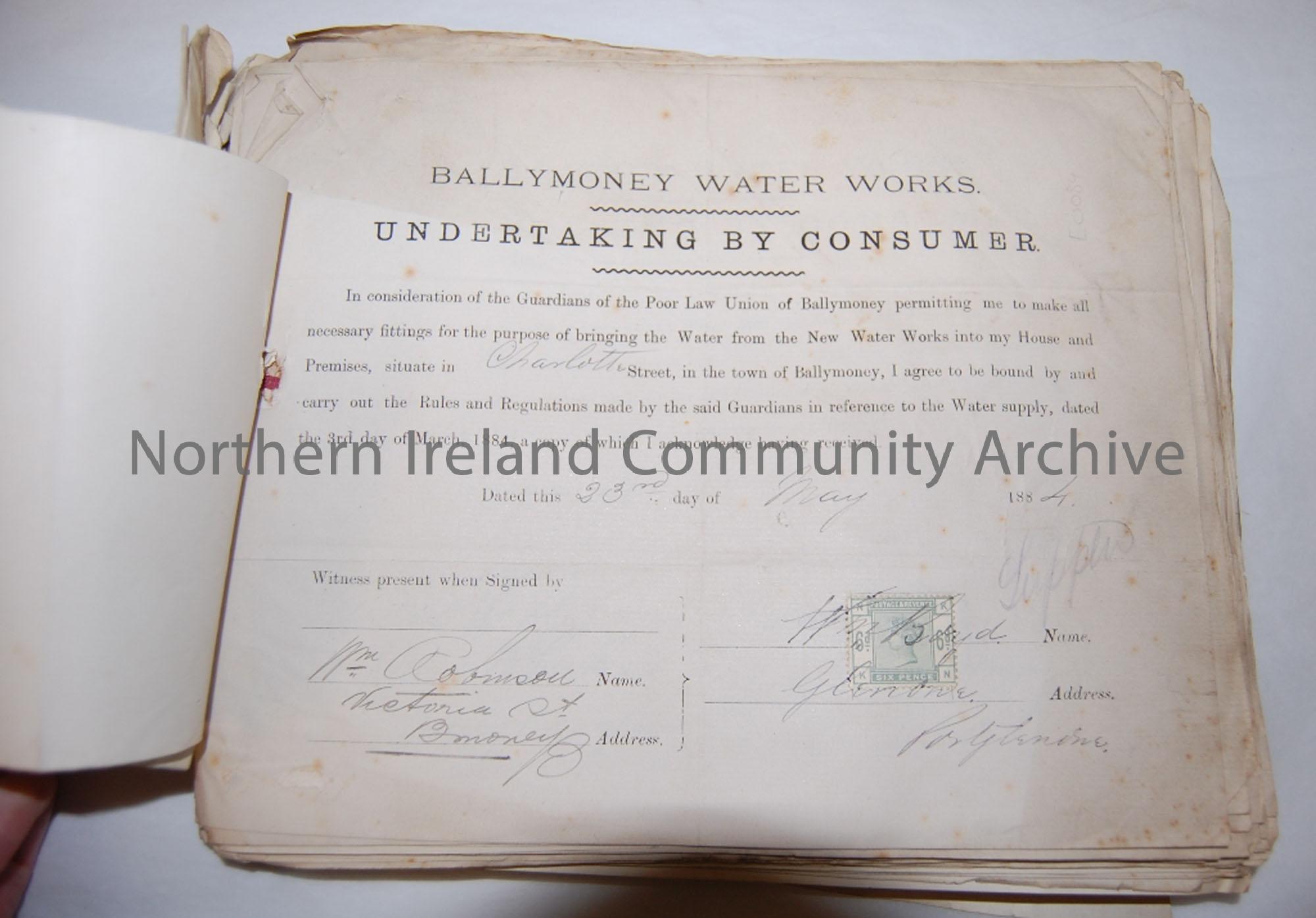Installation of water supply to residents in Ballymoney. Ballymoney water works documents undertaking by consumer.