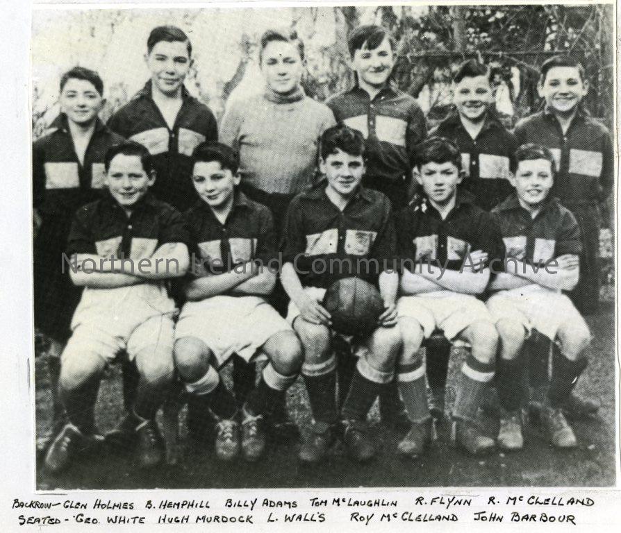 Intermediate School XI, Coleraine, 1957: Back Row- Glen Holmes, B. Hemphill, Billy Adams, Tom McLaughlin, R. Flynn, R. McClelland. Seated- Geo. White, Hugh Murdock, L. Walls, Roy McClelland, John Barbour.