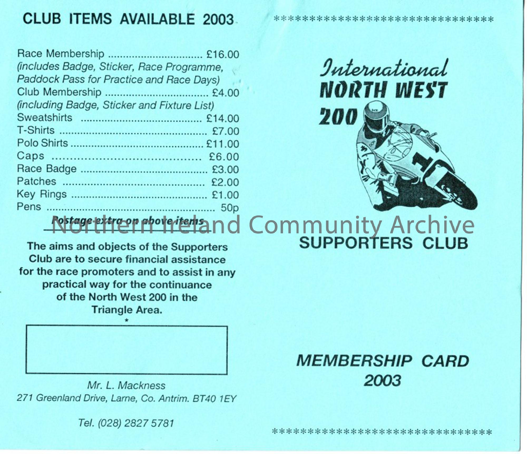 International North West 200 Supporters club membership card, 2002 & 2003