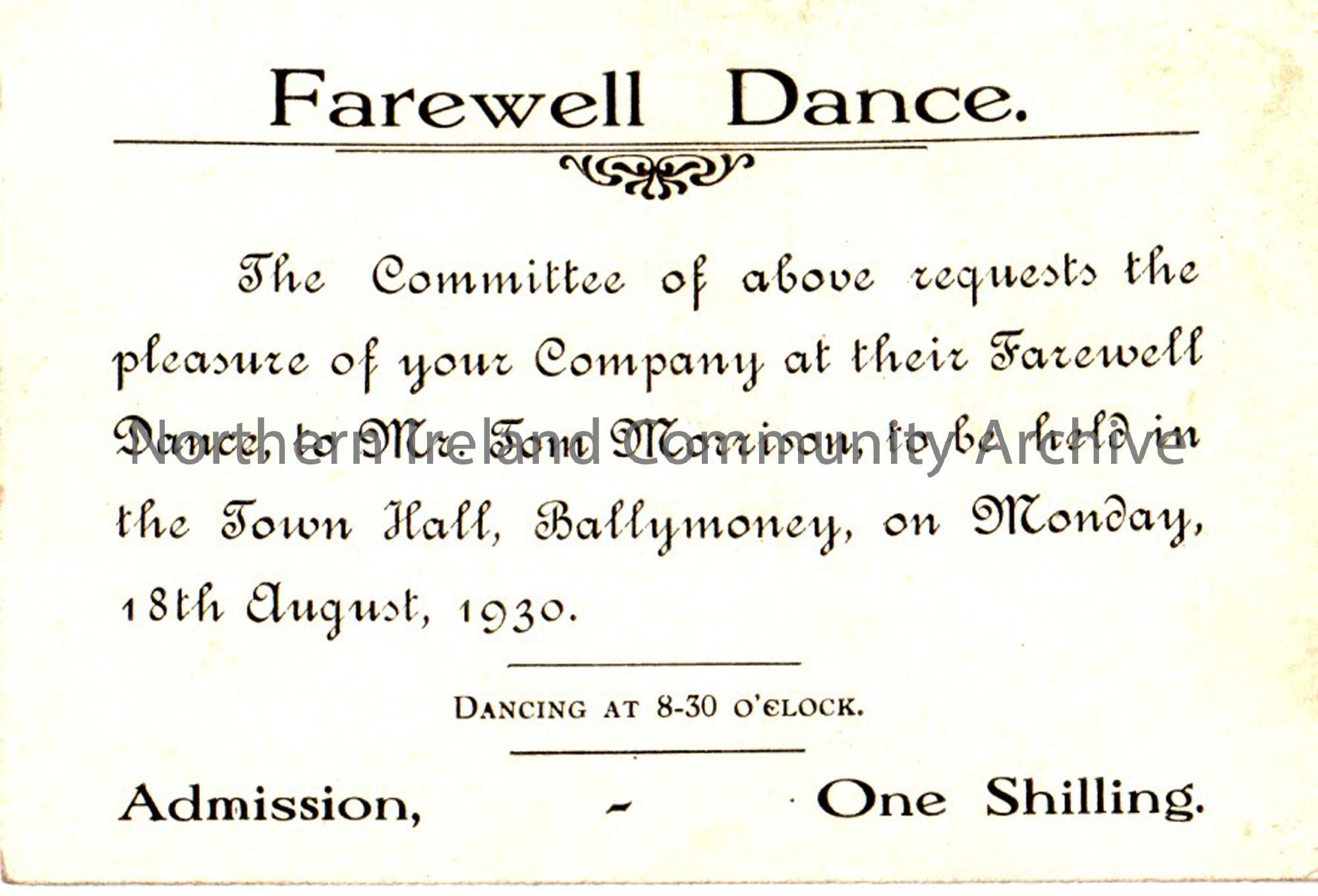 Invitation to a Farewell Dance for Mr. Tom Morrison, held in the Town Hall, Ballymoney, on Friday 18th August 1930