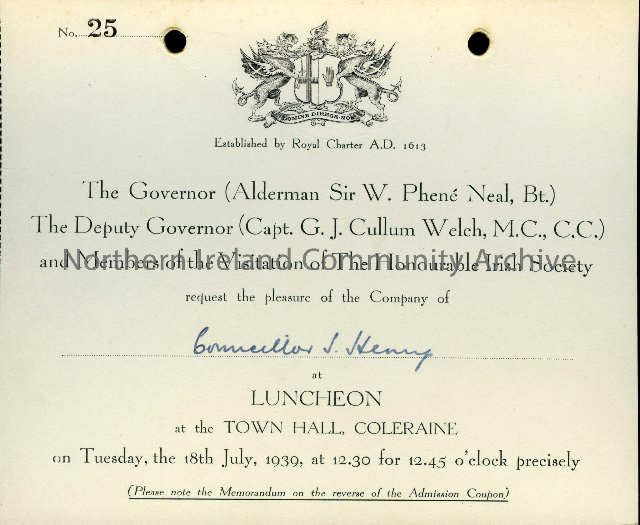 Invitation to a luncheon in the Town Hall, Coleraine on the occasion of the Visitation of the Honourable Irish Society on 18th July, 1939.