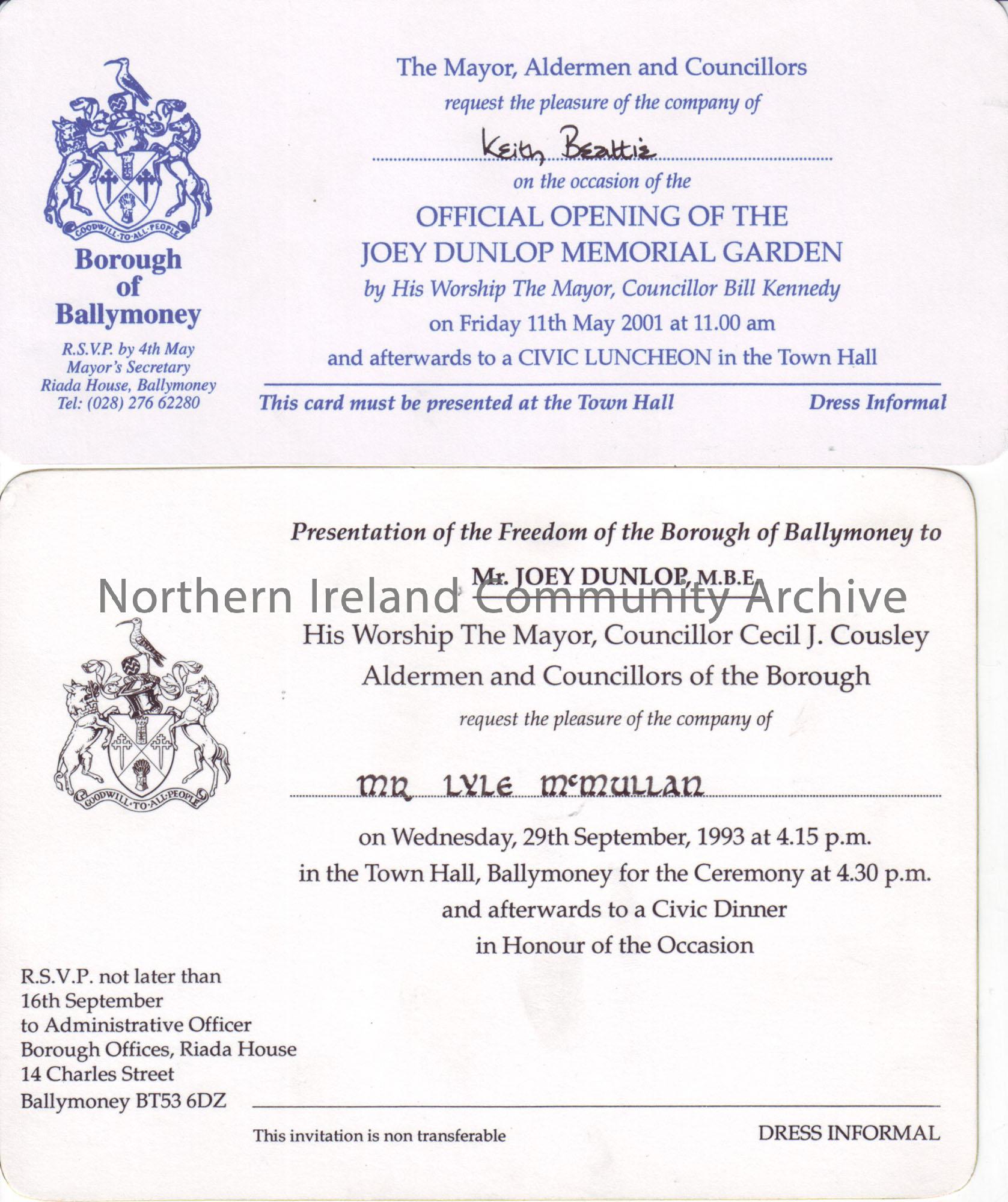 Invitation to Keith Beattie on the occasion of the official opening of the Joey Dunlop Memorial Garden by his worship The Mayor, councillor Bill Kenne…